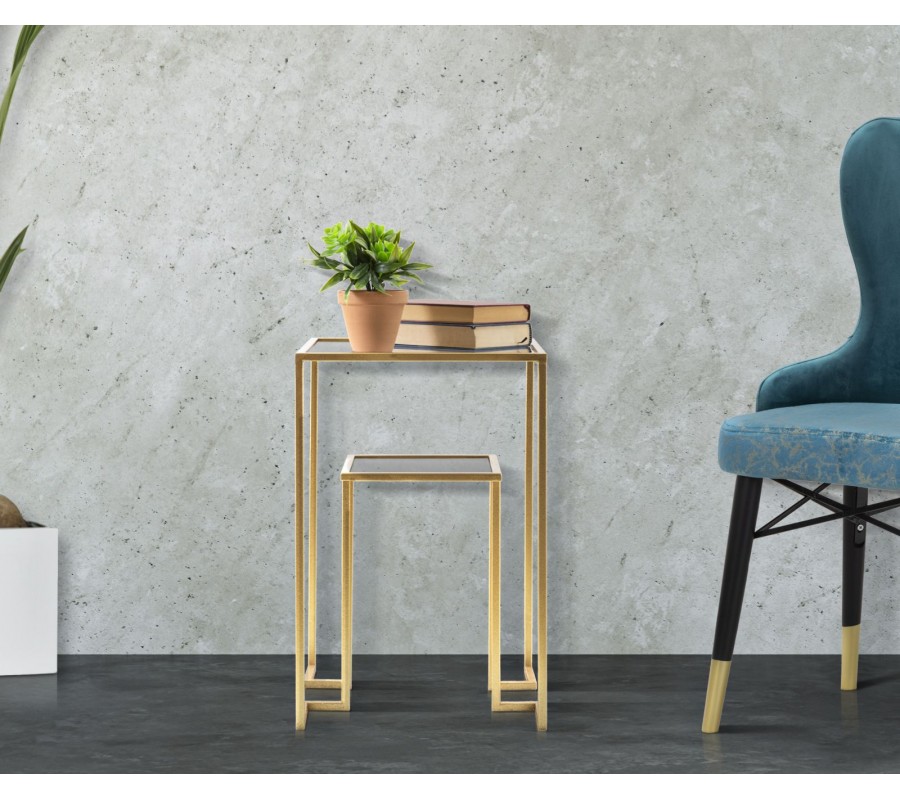 Príručný stolík Damin vyniká čistými geometrickými líniami a elegantnou symetriou, ktoré dokonale vystihujú art deco a glamour štýl. Jeho dve štvorcové sklenené dosky sú jemne tónované do sivej farby, pričom ich hladký a lesklý povrch dodáva stolíku sofistikovaný vzhľad a opticky zväčšuje priestor.