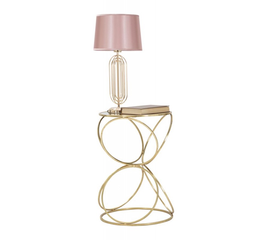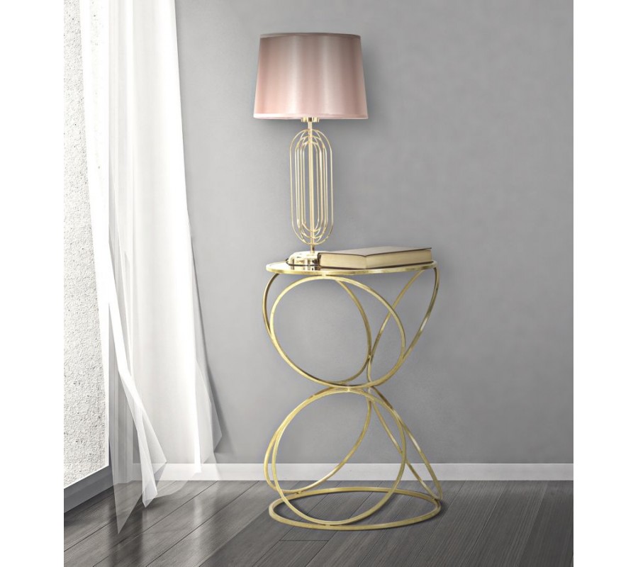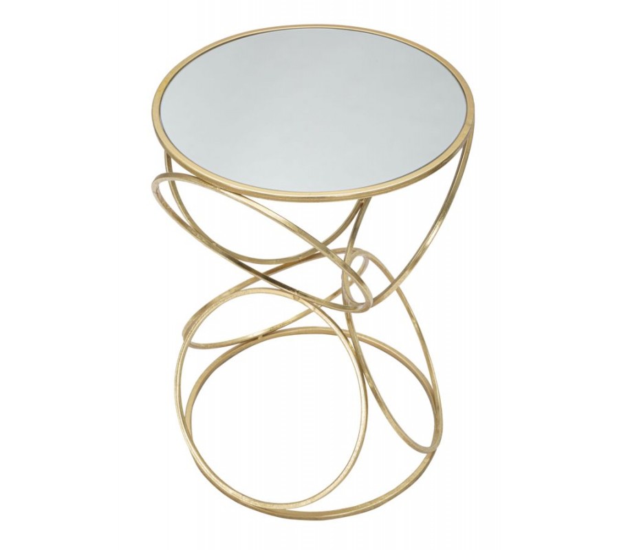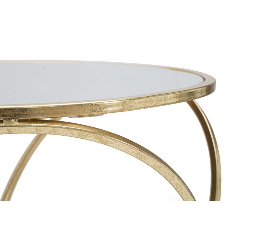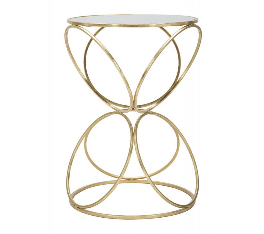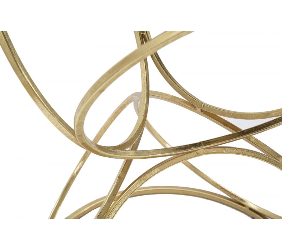 Konštrukcia stolíka je tvorená zlatými kovovými kruhmi, ktoré sú usporiadané do dekoratívneho symetrického vzoru pripomínajúceho presýpacie hodiny alebo prepletané ornamentálne slučky. Tento jedinečný tvar dodáva stolíku dynamický a vzdušný charakter, pričom jeho pevnosť je zaistená spodnou kruhovou spojnicou, ktorá stabilizuje celú konštrukciu.