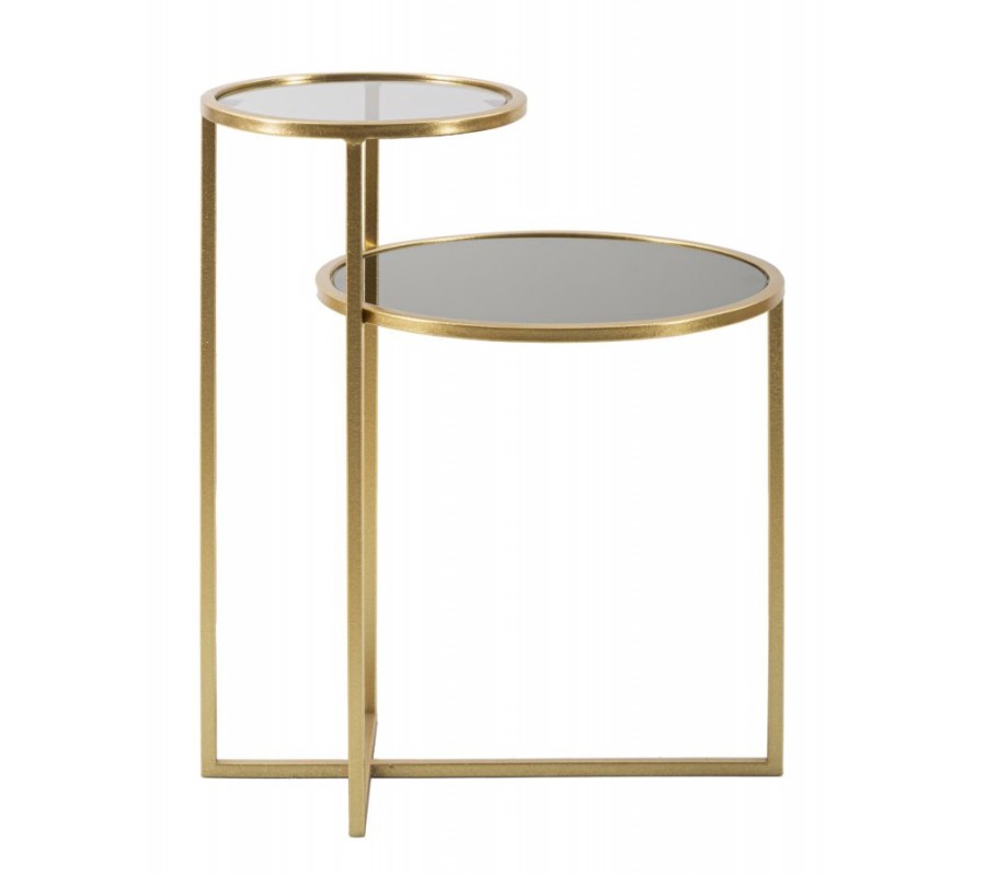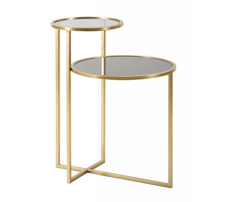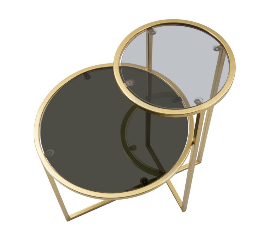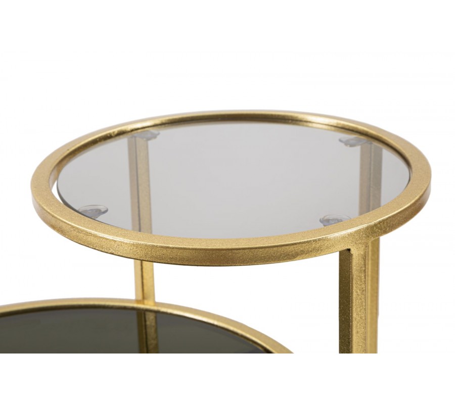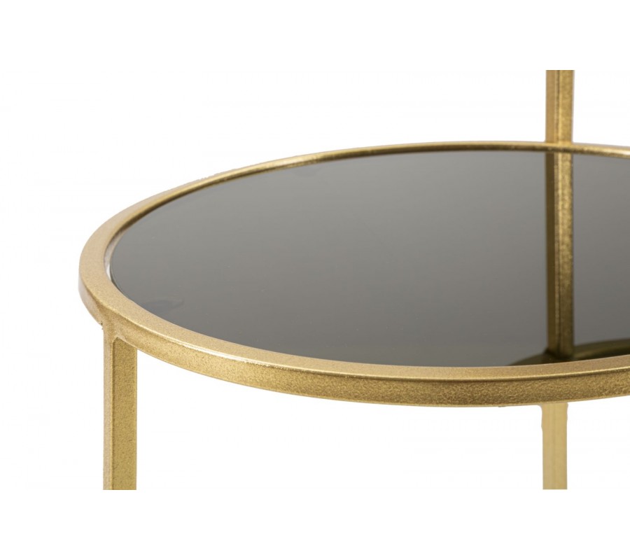Art deco okrúhly kovový zlatý dvojitý príručný stolík Dobles s dvomi sklenenými vrchnými tmavými doskami 60 cm