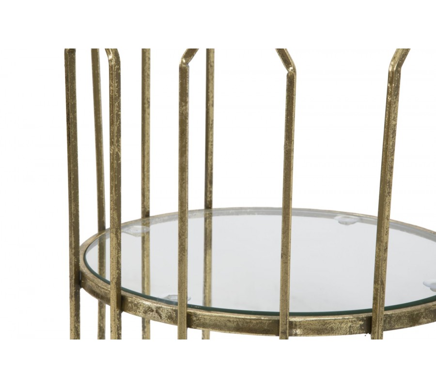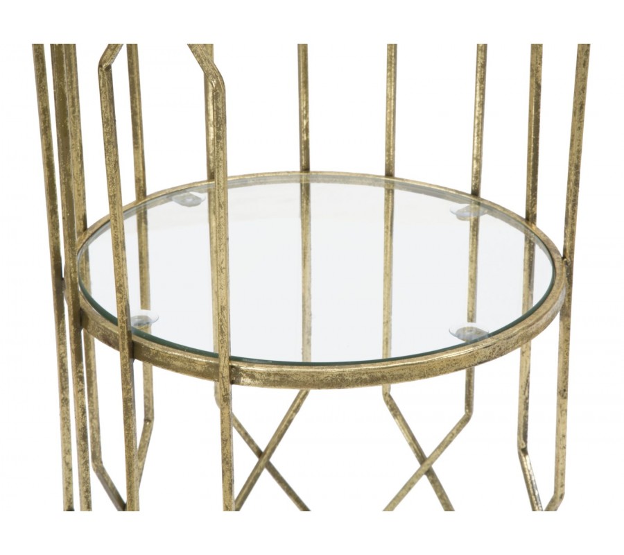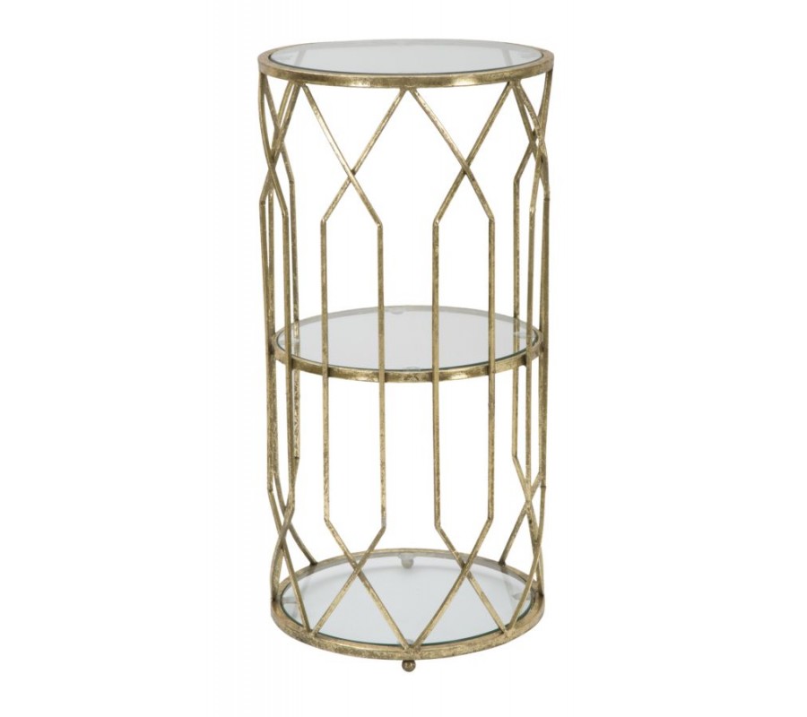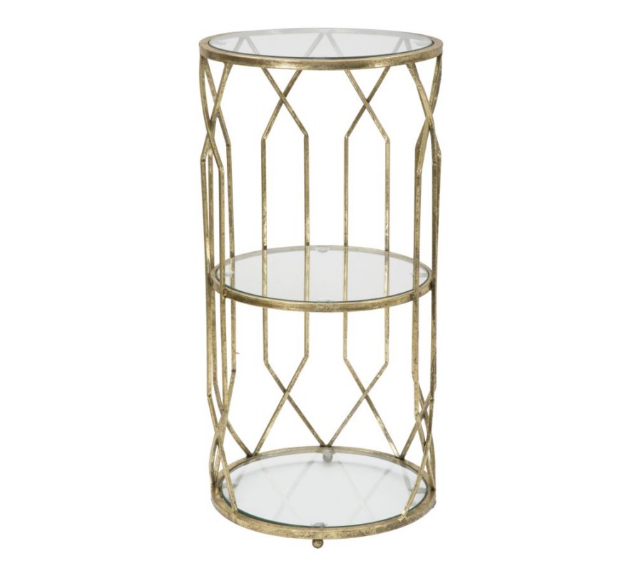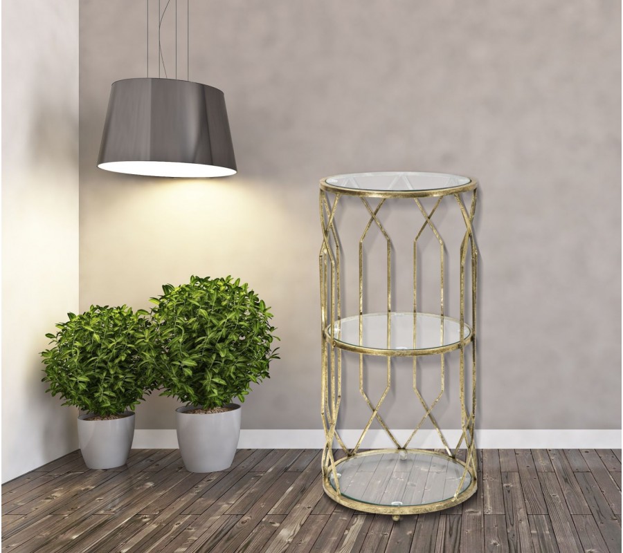 Príručný stolík Celestia v Art Deco štýle je skvostným doplnkom pre každý moderný interiér. Jeho kovová konštrukcia v zlatej farbe je elegantná a stabilná, pričom geometrický dizajn dodáva stolíku umelecký nádych. Sklenené dosky poskytujú praktickú funkčnosť a zároveň opticky zväčšujú priestor, čím dodávajú interiéru vzdušnosť.