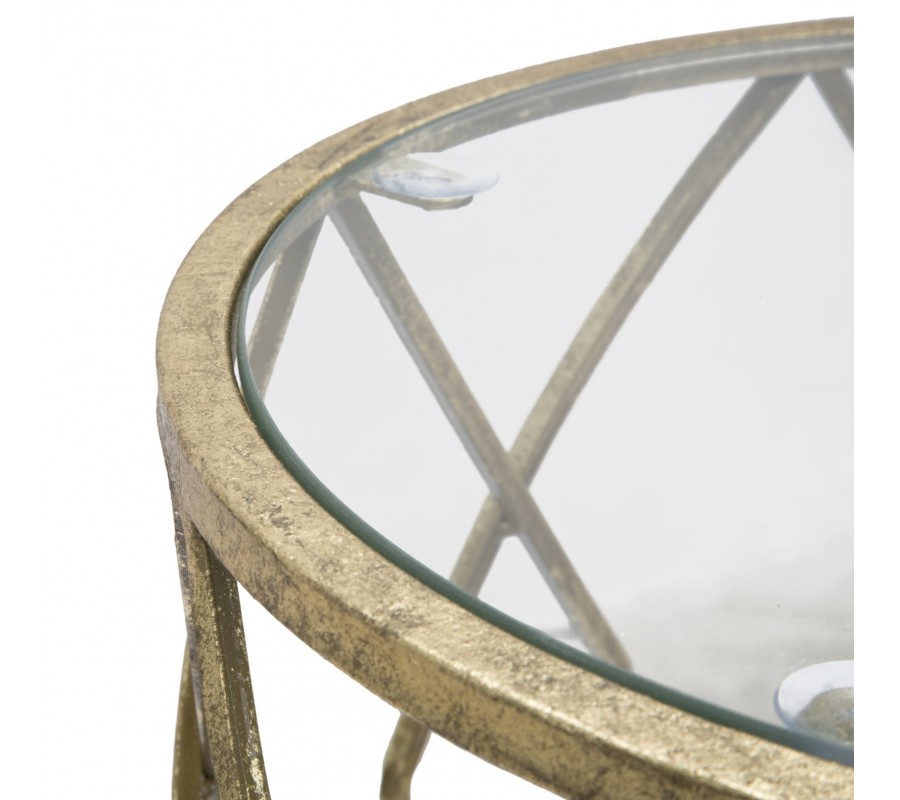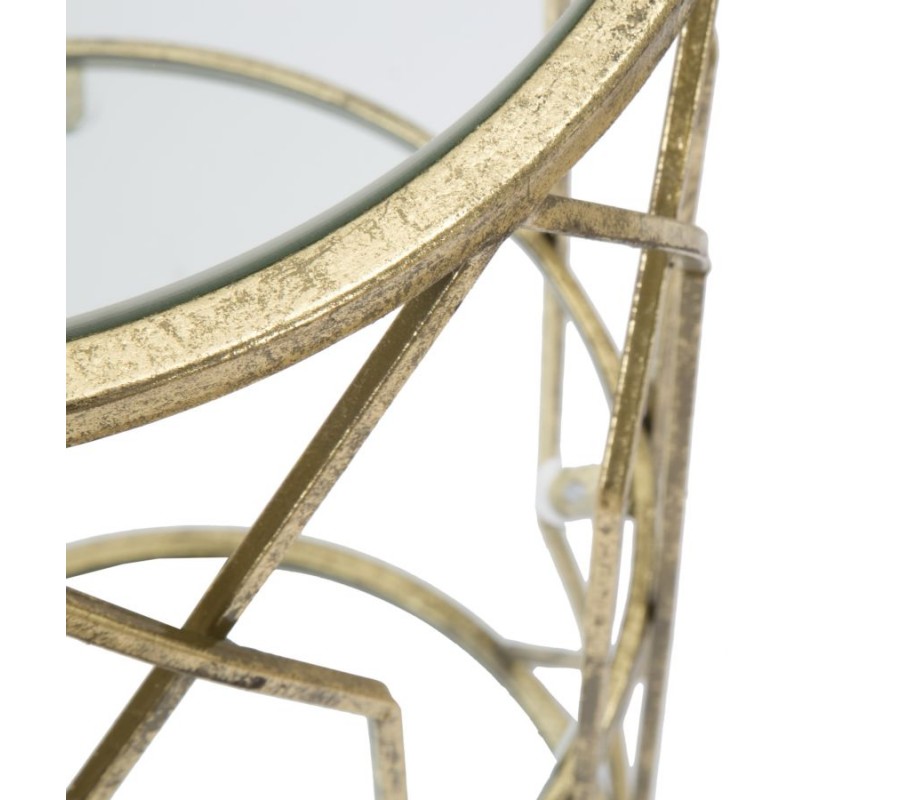 Art Deco príručný stolík Celestia s kovovou konštrukciou a sklenenými doskami v zlatej farbe a geometrickým dizajnom 71 cm