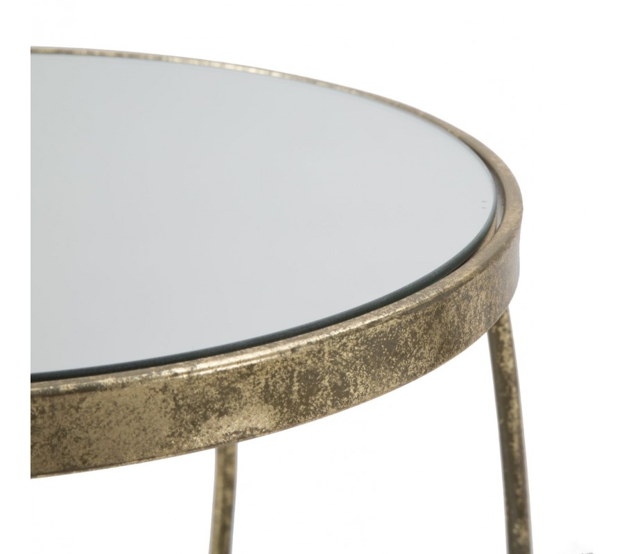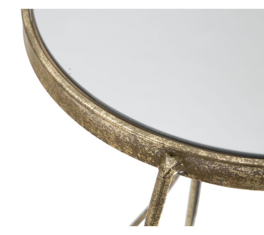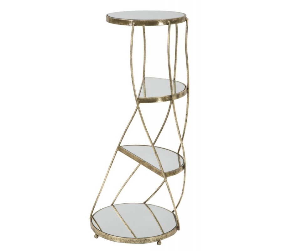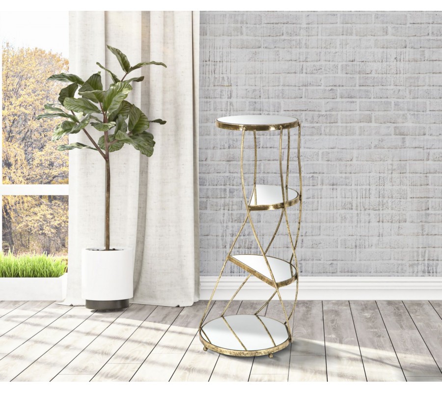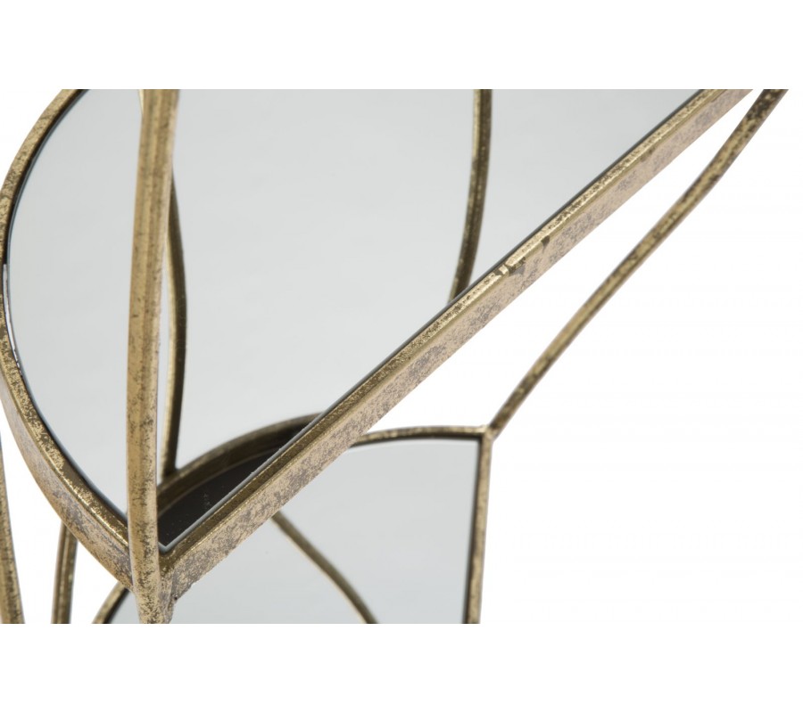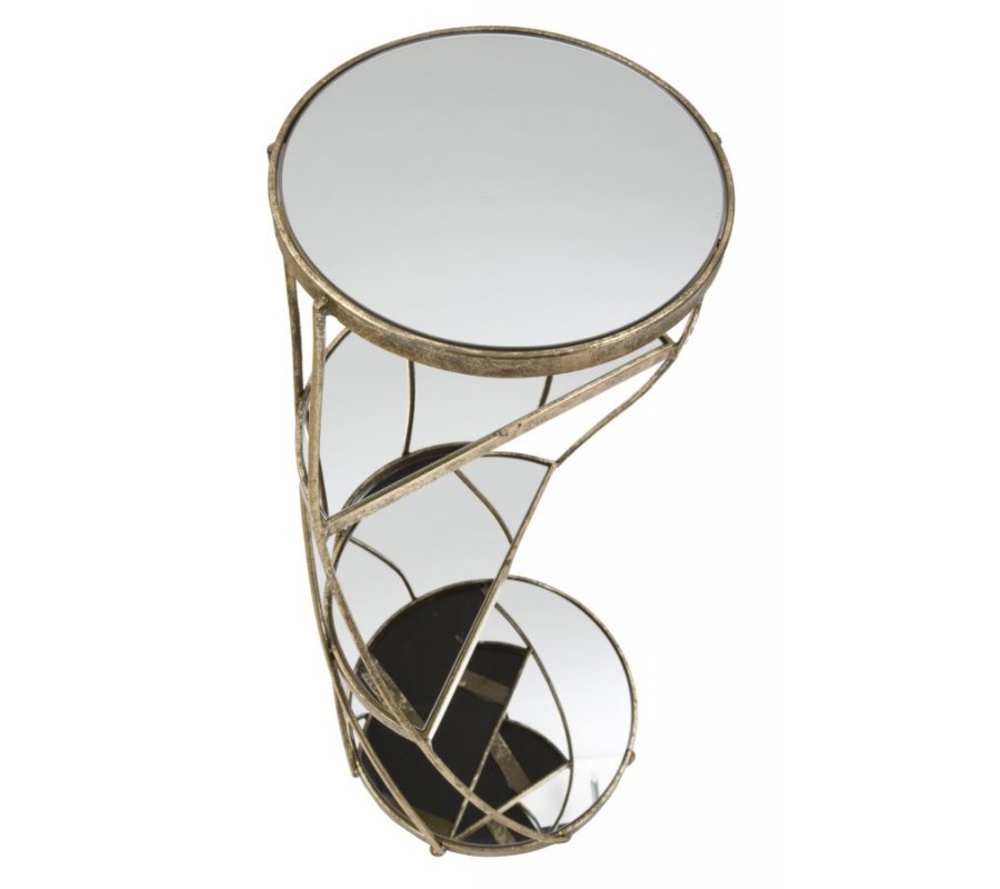 Príručný stolík Celestia sa vyznačuje okrúhlou vrchnou doskou zo zrkadlového skla, ktorá dodáva nábytku moderný a elegantný vzhľad. Stolík obsahuje tri policové úrovne, ktoré sú tiež vyrobené zo zrkadlového skla a vytvárajú vzdušný a jemný efekt. Zlatá kovová konštrukcia má atypický dizajn, kde krútiace sa línie tvoria zaujímavý vizuálny efekt a podporujú nezvyčajný tvar. Konštrukcia je vyrobená z kvalitného kovu s jemným, ale výrazným zlatým povrchom, ktorý dodáva nábytku luxusný a sofistikovaný vzhľad.