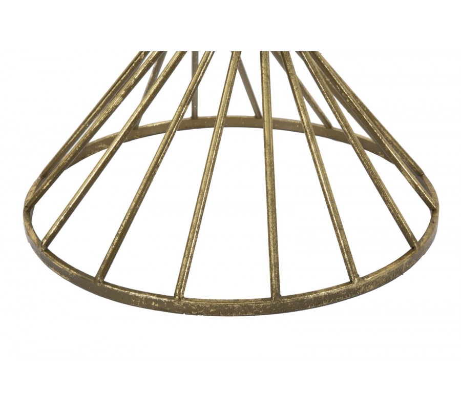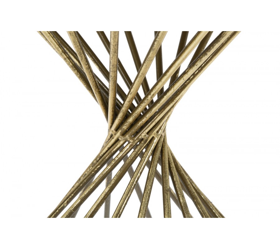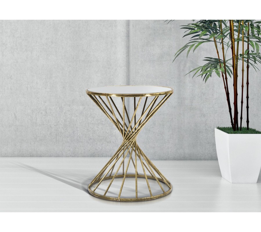 Kovová konštrukcia stolíka je vyrobená z zlatého kovu a tiahne sa do špirálového tvaru, ktorý začína úzkym základom a rozširuje sa smerom k vrchnej doske. Tento špirálový dizajn vytvára dynamický a plynulý pohyb, ktorý pridáva stolíku vizuálnu ľahkosť a moderný vzhľad. Tvar konštrukcie je nielen esteticky príťažlivý, ale aj stabilný, poskytujúc potrebnú oporu pre zrkadlovú dosku a celkovú štruktúru stolíka.