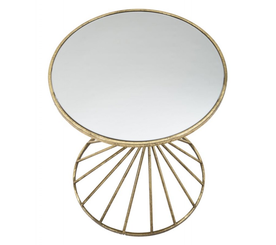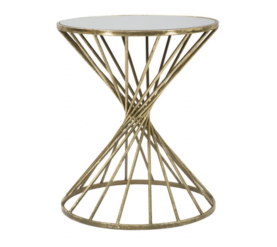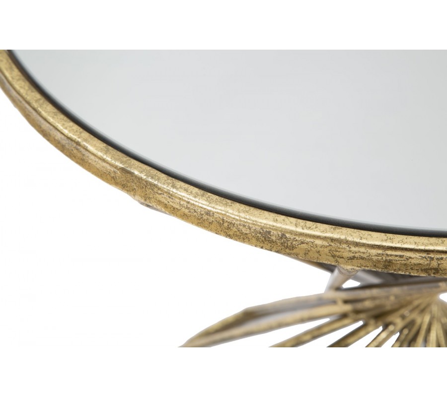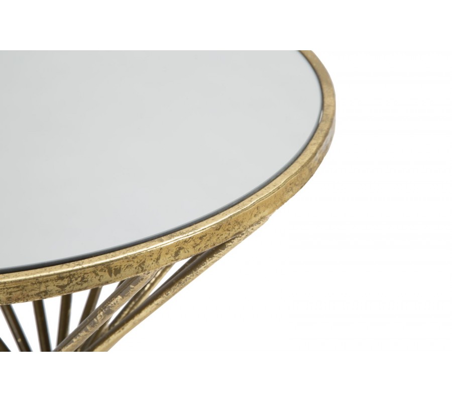 Art deco príručný stolík Elizia so zlatou kovovou konštrukciou a okrúhlou zrkadlovou doskou so špirálovým dizajnom 50 cm