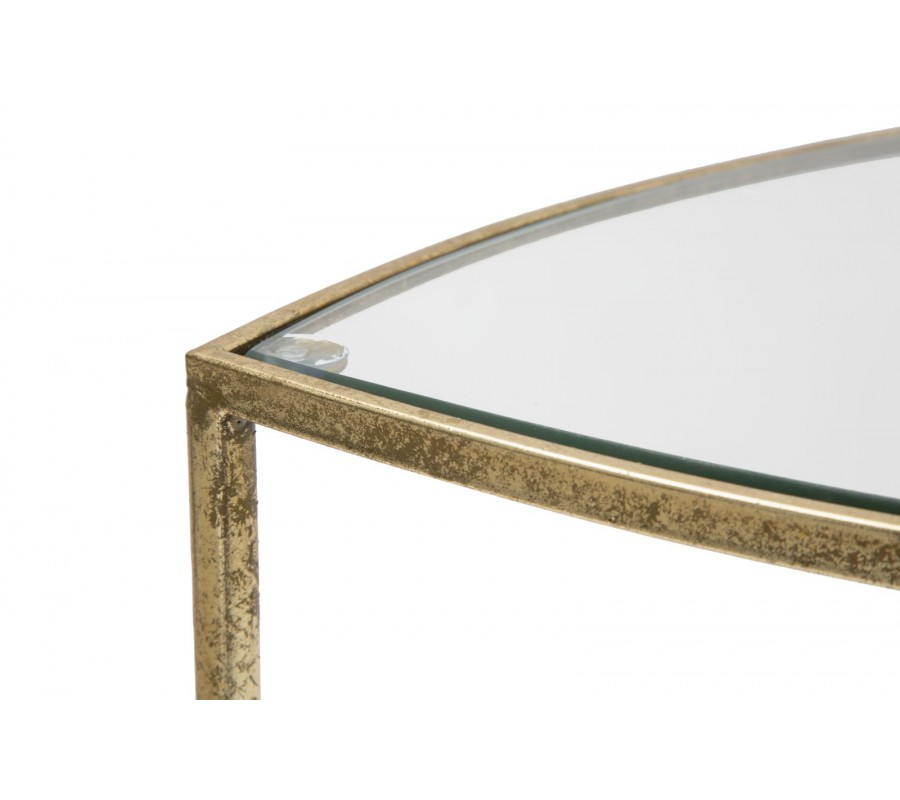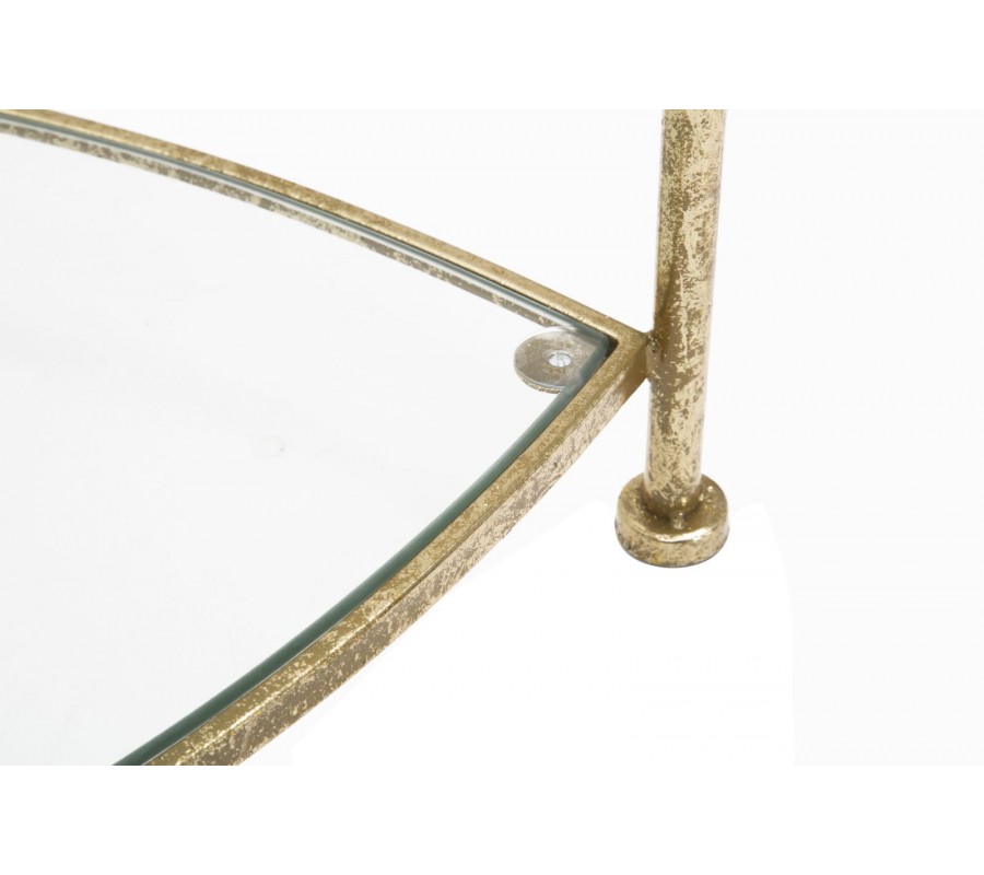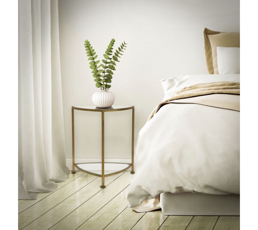 Príručný stolík Vesper je ideálnym doplnkom pre moderný interiér s nádychom Art deco štýlu. Jeho trojuholníkový tvar ponúka jedinečný dizajn, ktorý dokonale ladí s minimalistickými a luxusnými štýlmi. Stolík má sklenenú policu, ktorá je priehľadná a v kombinácii s kovovou konštrukciou vytvára elegantný a sofistikovaný vzhľad. Zlatý kov, z ktorého je vyrobený rám, dodáva nábytku jemný, no výrazný lesk, ktorý sa hodí do akéhokoľvek moderného interiéru.