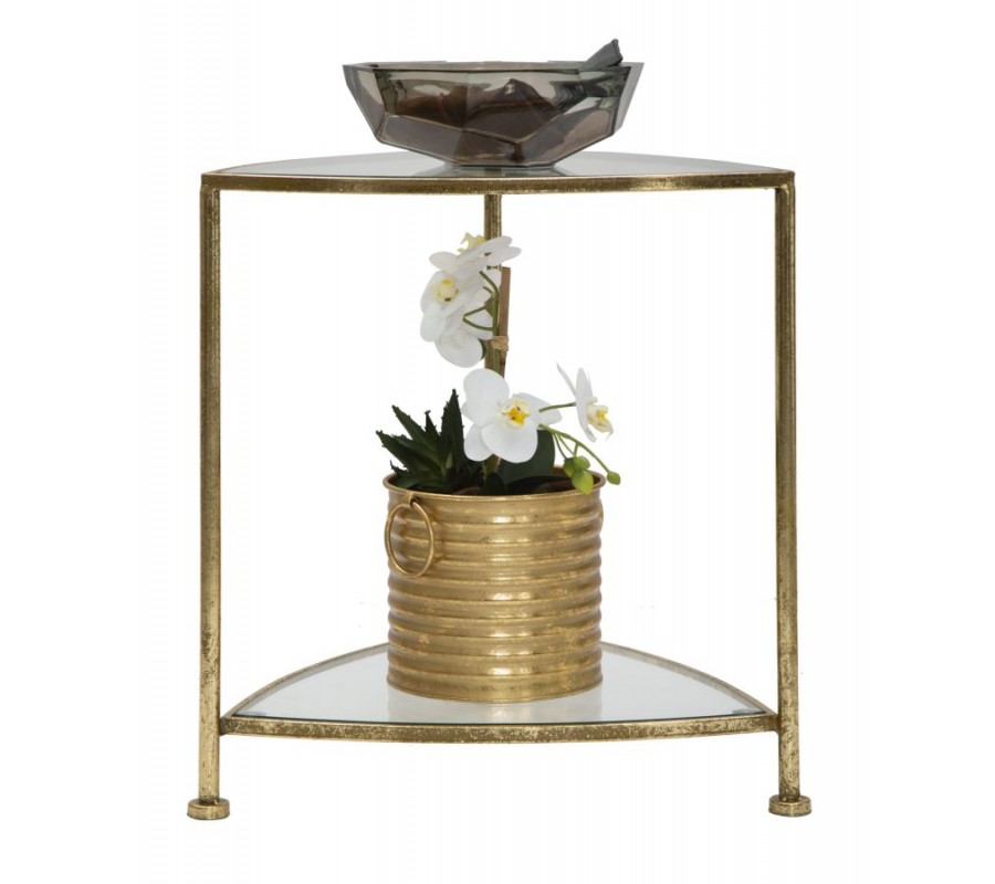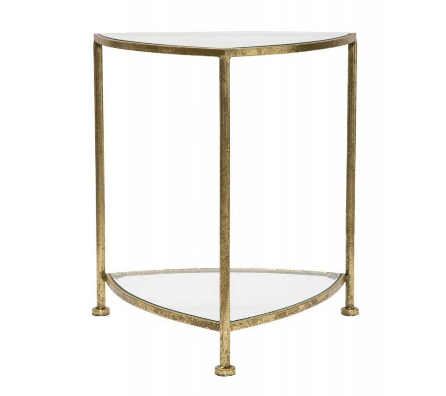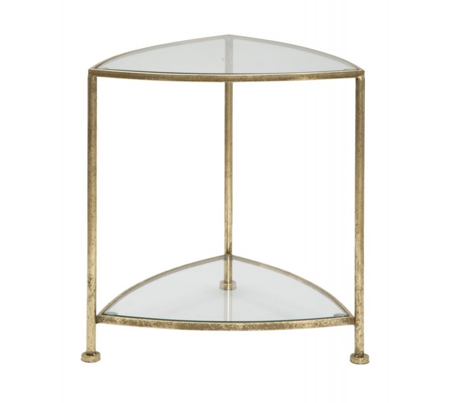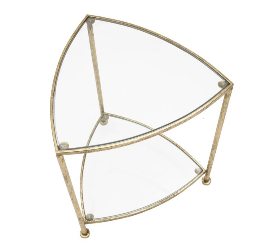 Art deco príručný stolík Vesper so zlatou kovovou konštrukciou a trojuholníkovou sklenenou policou 50 cm
