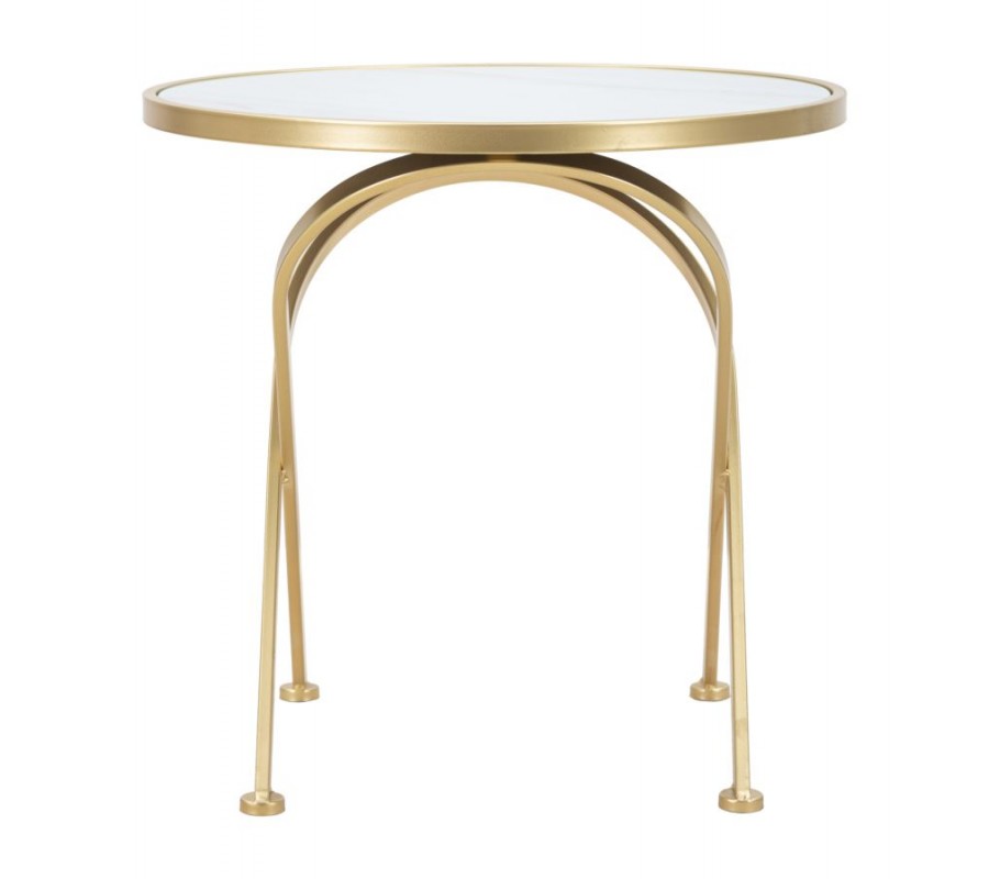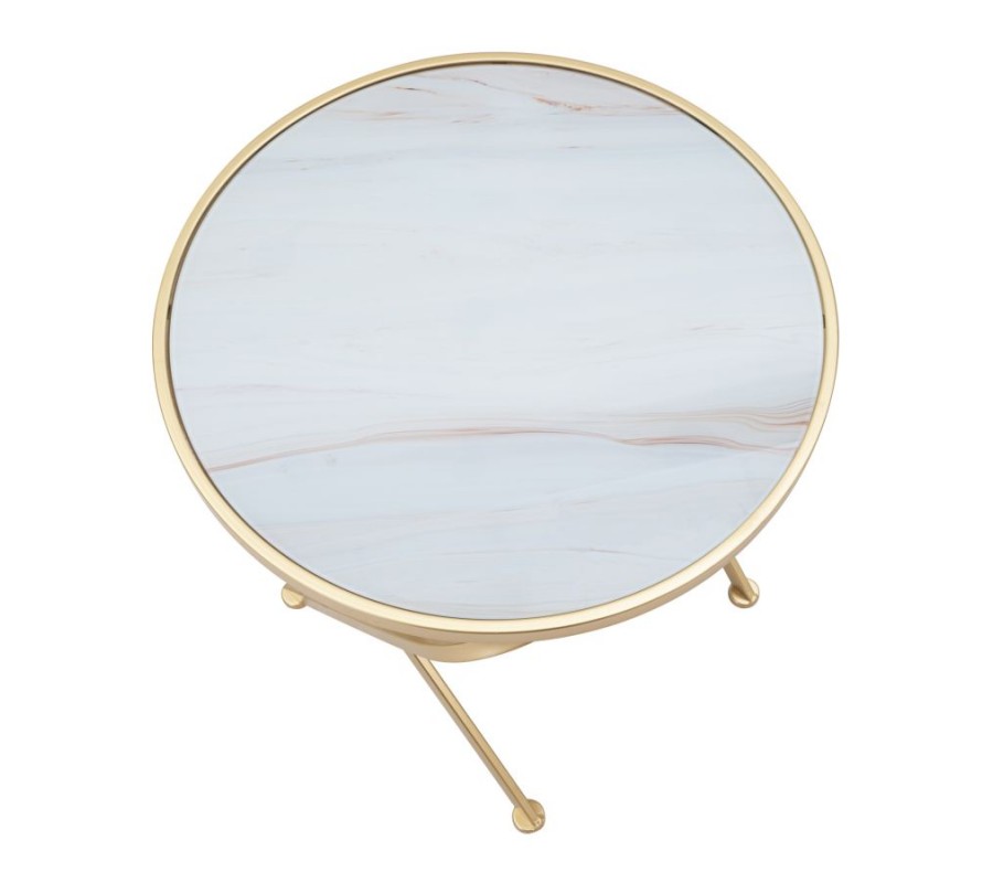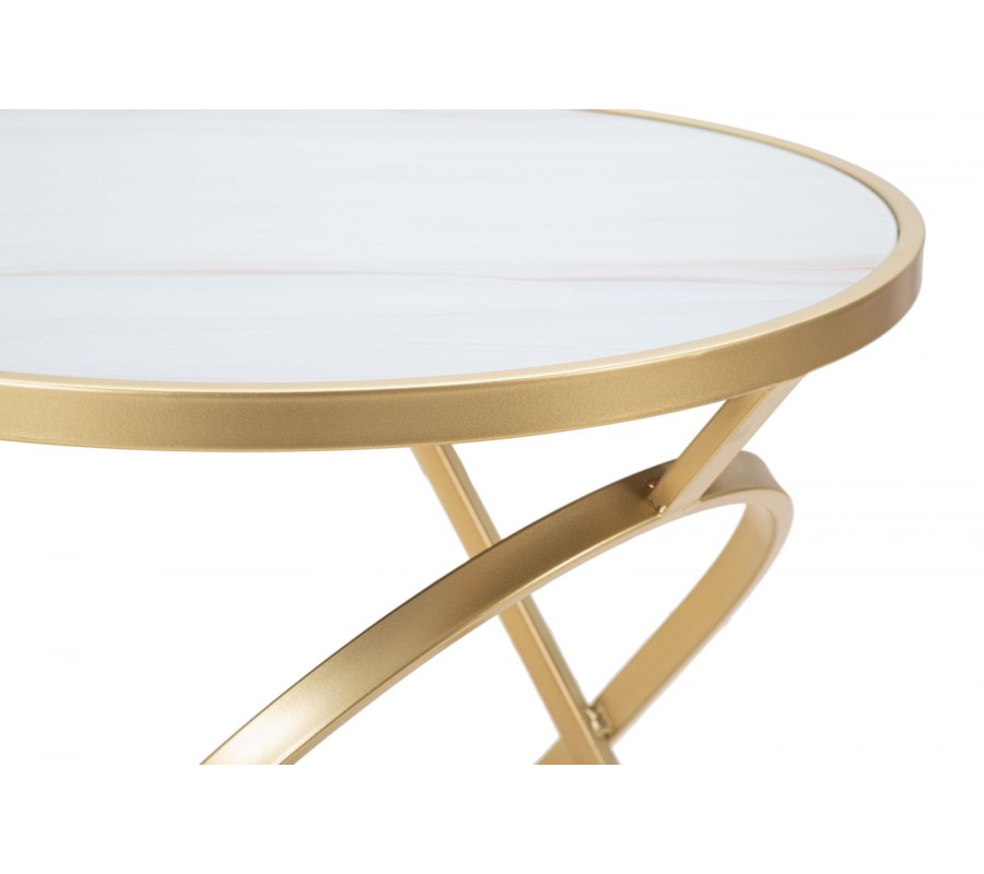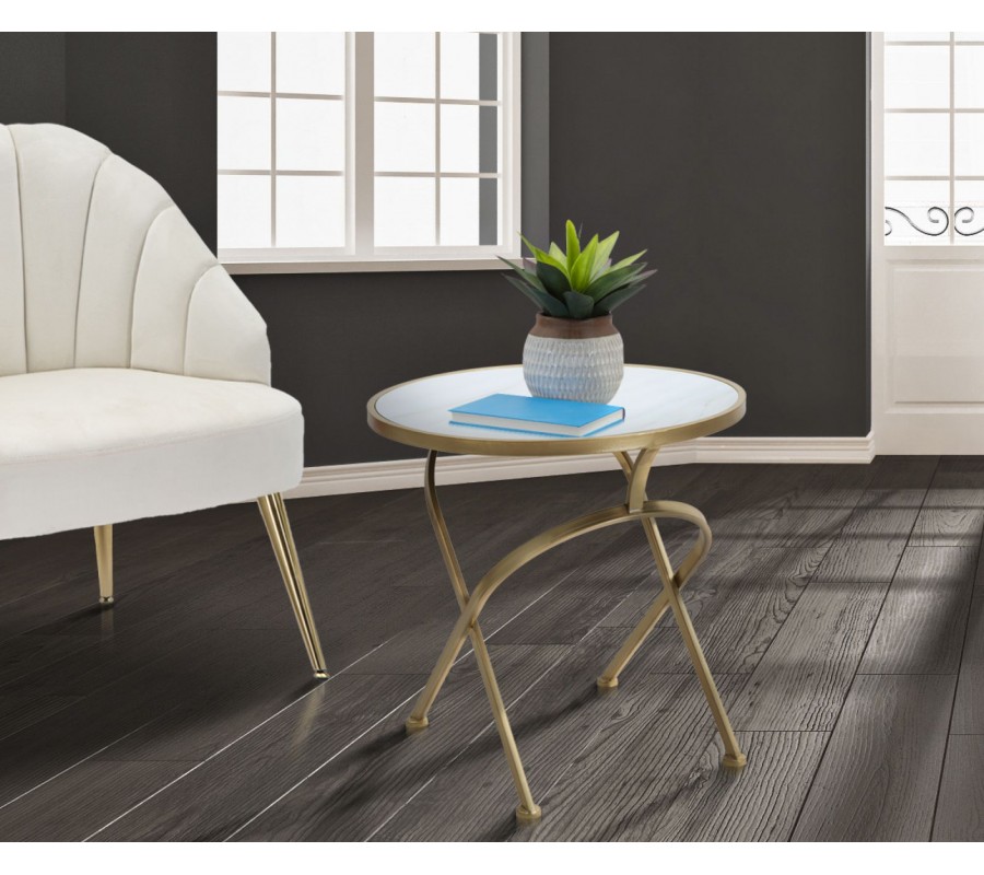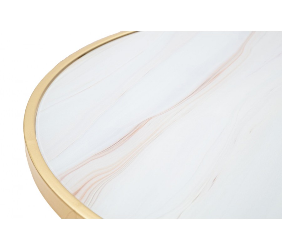 Art deco príručný stolík Amadora so zlatou kovovou konštrukciou a okrúhlou bielou sklenenou doskou s mramorovým efektom 50 cm