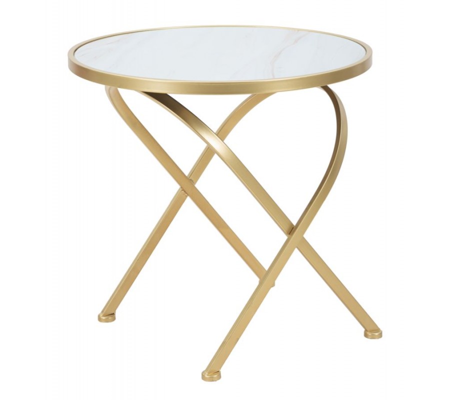 Kovová konštrukcia s charakteristickým tvarom krížových nôh dodáva stolíku moderný a sofistikovaný vzhľad, pričom zabezpečuje stabilitu a funkčnosť. Zlaté nožičky sú tvarované s jemnými oblúkmi, ktoré spájajú estetiku a funkčnosť, pričom ich jemný lesk ešte viac podčiarkuje celkový vizuálny dojem.