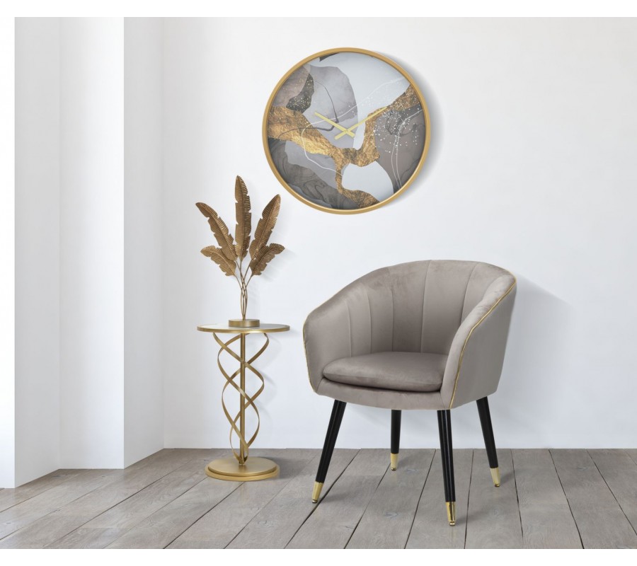Príručný stolík Amadora je vynikajúcim príkladom Art deco štýlu, ktorý sa vyznačuje elegantnou zlatou kovovou nohou a sklenenou vrchnou doskou s jemným mramorovým vzorom v odtieňoch bielej a šedej. Stolík má jednu kovovú nohu so spirálovým detailom, ktorý sa tiahne až k kruhové podstave. Tento unikátny dizajn nohy poskytuje stolíku nielen stabilitu, ale aj zaujímavý vizuálny efekt, ktorý podčiarkuje jeho luxusný vzhľad.