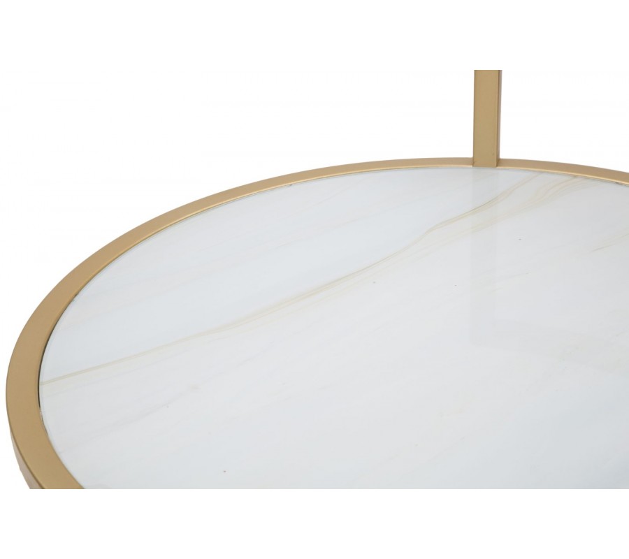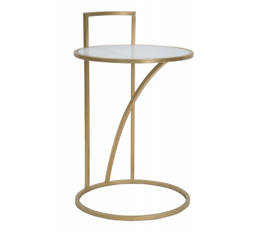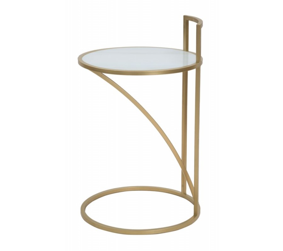 Glamour príručný stolík Amadora so zlatou kovovou konštrukciou s oblúkovým dizajnom a mliečnou sklenenou doskou 61 cm