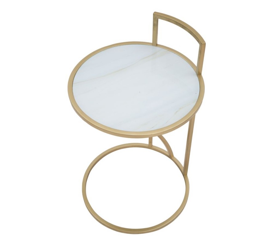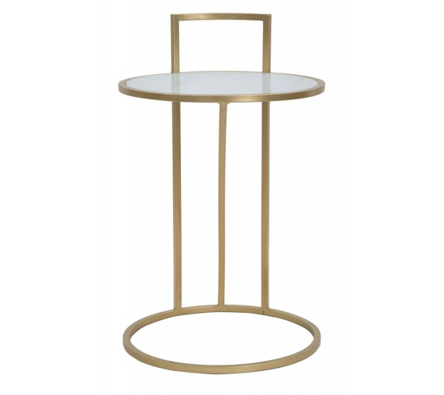 Príručný stolík Amadora v sebe spája luxusný dizajn a funkčnosť, pričom jeho zlatá kovová konštrukcia mu dodáva vzdušný a elegantný vzhľad. Okrúhla sklenená doska s mramorovým efektom v jemnom mliečnom odtieni vytvára sofistikovaný kontrast k lesklému kovu. Hranatá úchytka nad doskou pridáva na exkluzivite a zároveň uľahčuje manipuláciu so stolíkom.