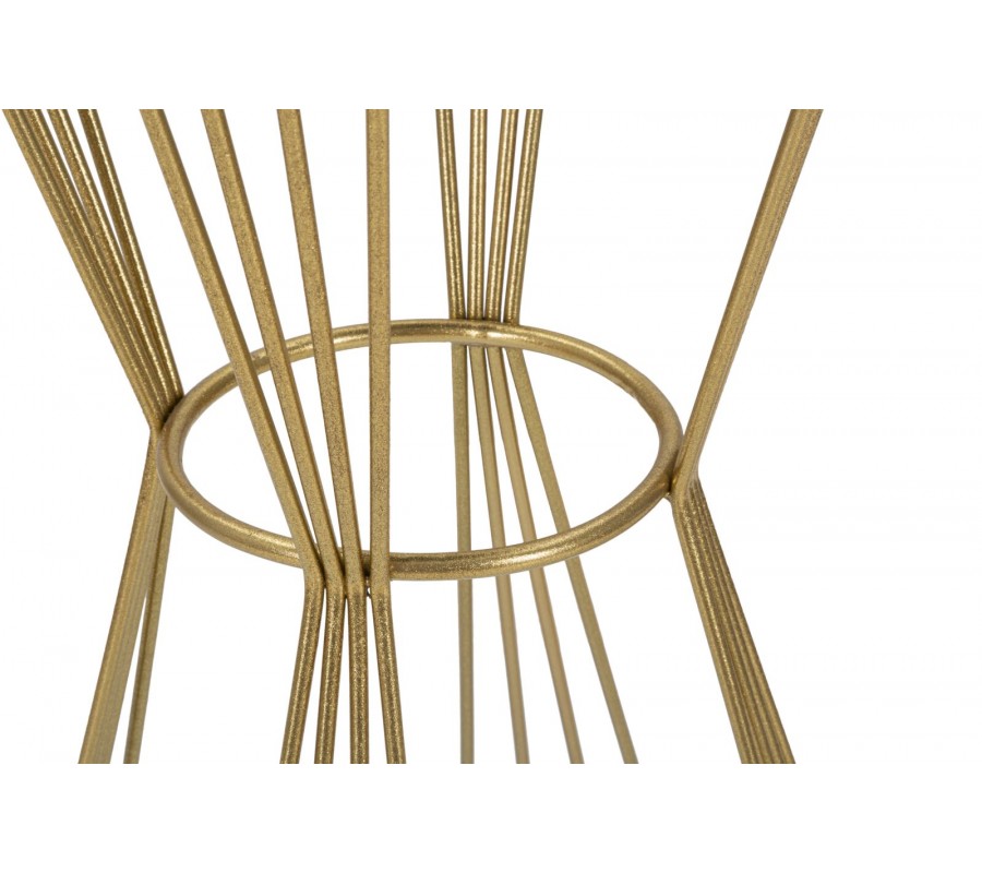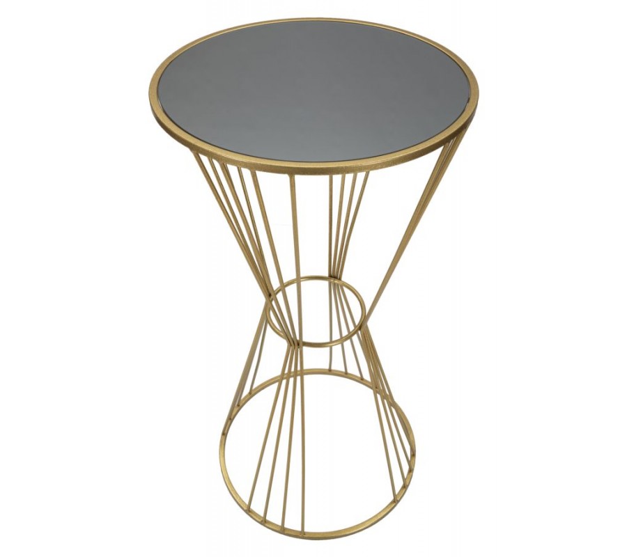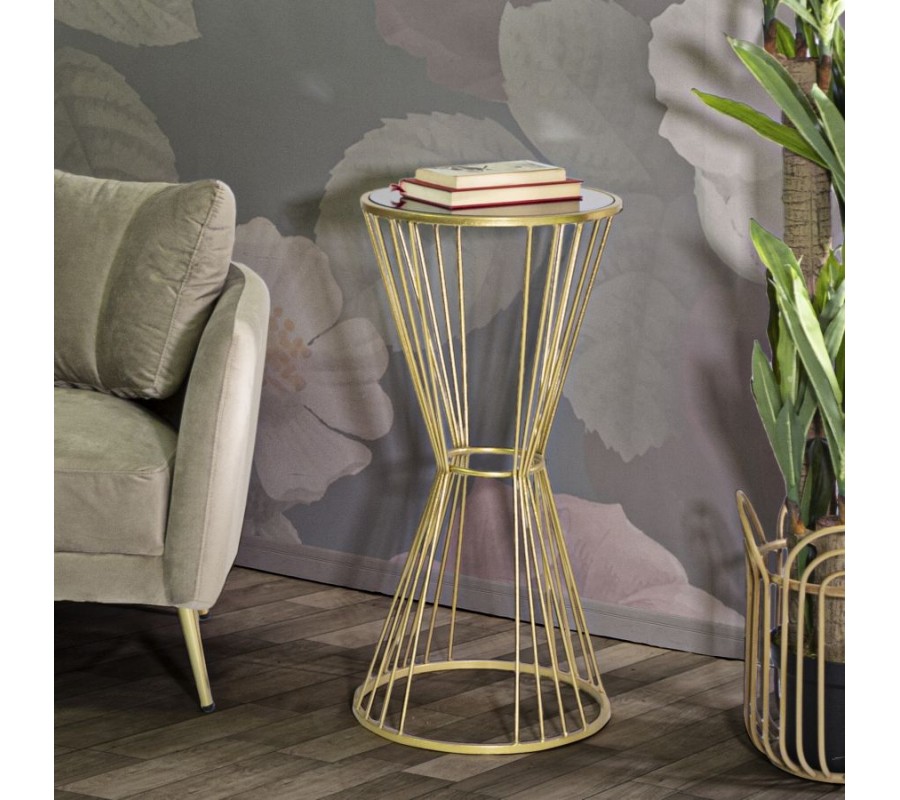 Príručný stolík Samer je štýlovým doplnkom do luxusných a elegantných interiérov, v ktorých vynikne svojím sochárskym dizajnom. Kovová konštrukcia v zlatej farbe je lesklá a hladká, pričom jeho noha je tvorená zalomenými kovovými tyčami, ktoré sa v strede spájajú spojovacím kruhom a ďalej pokračujú do širšej základne, ktorú opäť spevňuje spodná kruhová spojnica. Tento dynamický dizajn vytvára efekt presýpacích hodín, čím dodáva stolíku vzdušný a sofistikovaný vzhľad.