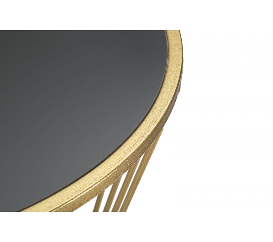 Okrúhla vrchná doska je vyrobená z nepriehľadného čierneho skla, pričom je vystužená MDF dyhou, vďaka čomu je pevná a odolná. Lesklý povrch vytvára kontrast so zlatým rámom, čím pôsobí elegantne a nadčasovo.