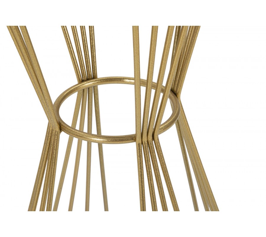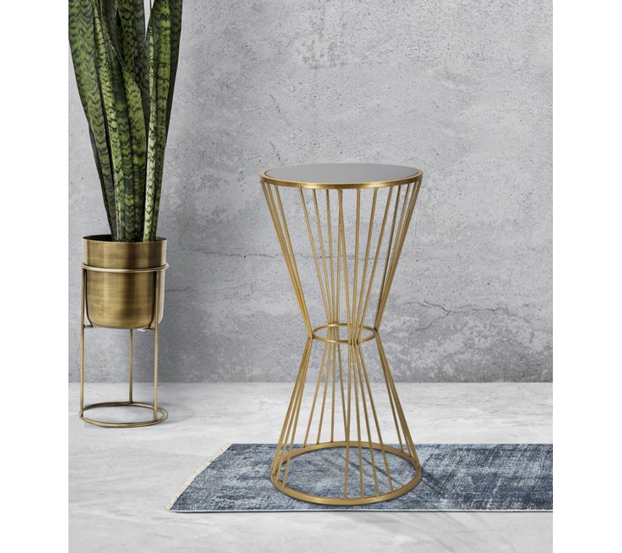 Príručný stolík Samer spája luxusný dizajn s architektonickou precíznosťou, vďaka čomu sa stáva elegantným doplnkom do glamour a art deco interiérov. Jeho konštrukcia z kovových tyčí v zlatej farbe je lesklá, hladká a precízne tvarovaná, pričom noha má dynamický dizajn pripomínajúci presýpacie hodiny. Kovové tyče sú zalomené v strede, kde sa spájajú kovovým kruhom, čím vytvárajú harmonický a symetrický tvar. Stabilitu stolíka zaisťuje spodná kruhová spojnica, ktorá zároveň podčiarkuje jeho vzdušnosť a odľahčený vzhľad.