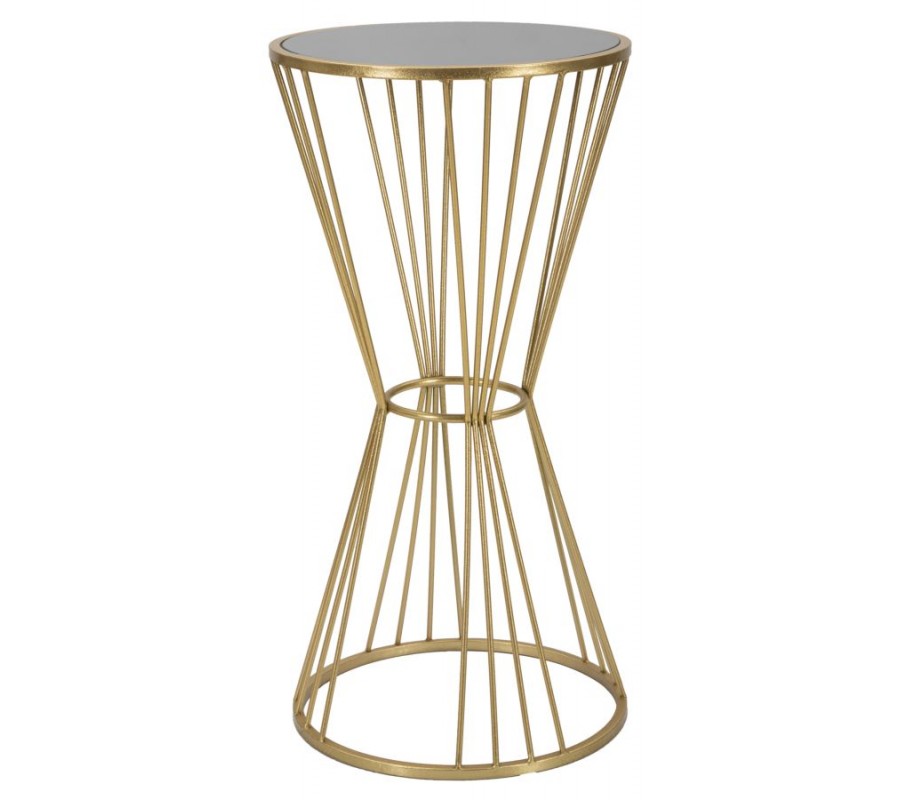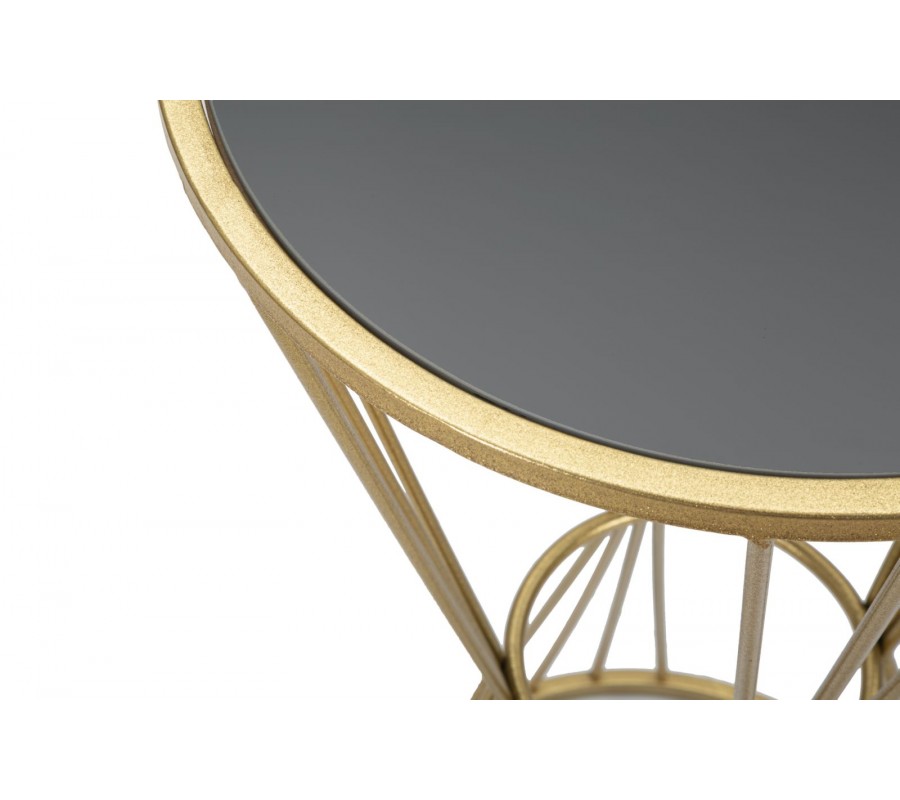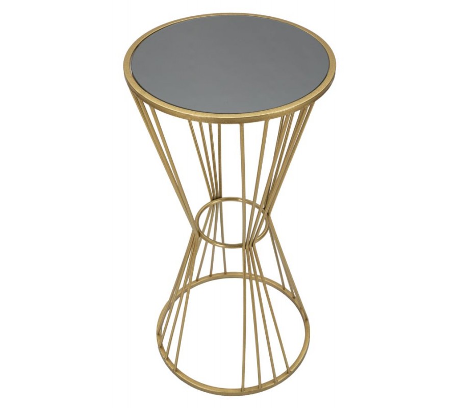 Art deco okrúhly kovový zlatý príručný stolík Samer s nohou v tvare presýpacích hodín s vrchnou sklenenou čiernou doskou 80 cm