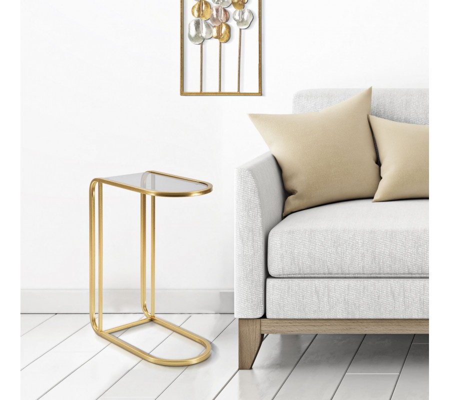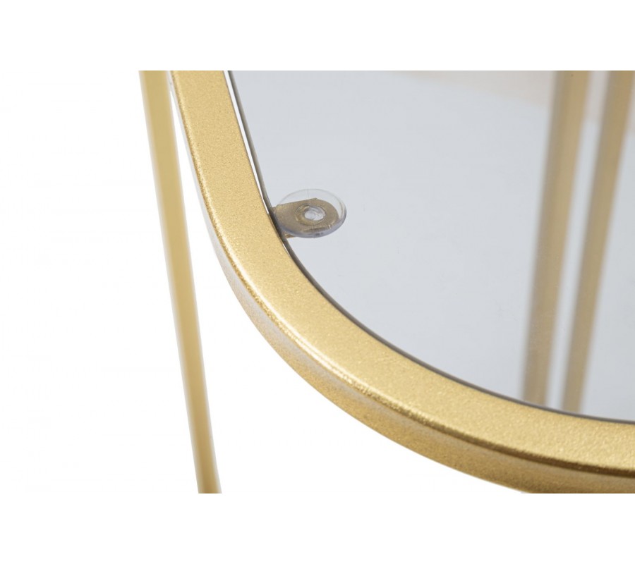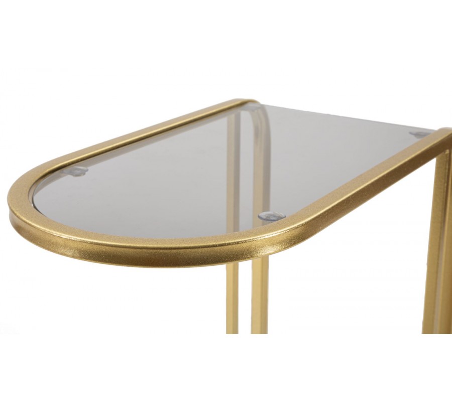 Príručný stolík Magnus v glamour a art deco štýle vyniká svojím elegantným obdĺžnikovým tvarom so zaoblenými hranami a minimalistickou kovovou konštrukciou v lesklej zlatej farbe. Stabilitu zabezpečuje obdĺžniková podstava so zaoblenými rohmi, na ktorú nadväzujú jemné kovové tyče. Tie vytvárajú ladný oblúkový prechod medzi spodnou časťou a vrchnou doskou, čím dodávajú dizajnu vzdušnosť a ľahkosť. Dve tyče sú doplnené ako dekoratívny a funkčný prvok, ktorý spája vrchnu a dolnú časť stolíka. Vrchná doska je z priehľadného skla v jemnej sivej farbe, má hladký a lesklý povrch.