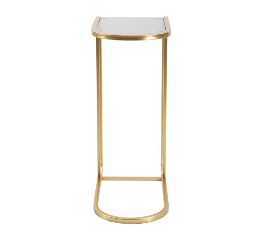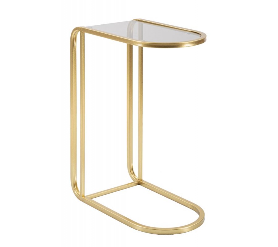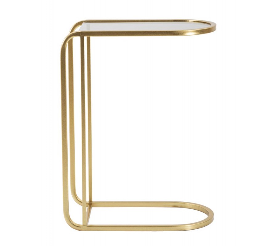 Art deco zlatý kovový obdĺžnikový príručný stolík Magnus so zaoblenými rohmi a vrchnou priehľadnou sklenenou doskou 60 cm