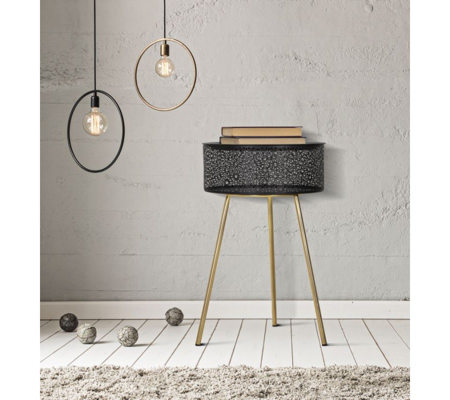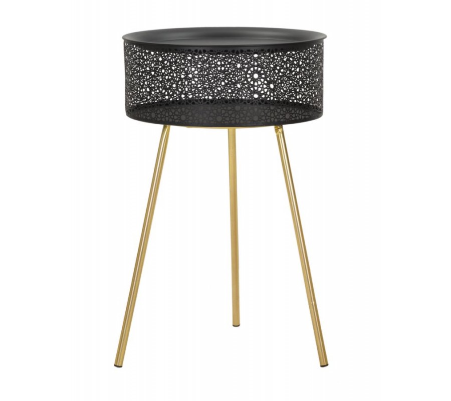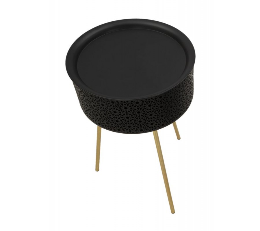 Základ stolíka tvorí okrúhly úložný priestor, ktorý po celom obvode zdobí perforovaný vzor. Jemné geometrické ornamenty inšpirované arabeskovým motívom vytvárajú vzdušný a nápaditý efekt. Tento detail dodáva stolíku jedinečný estetický charakter.