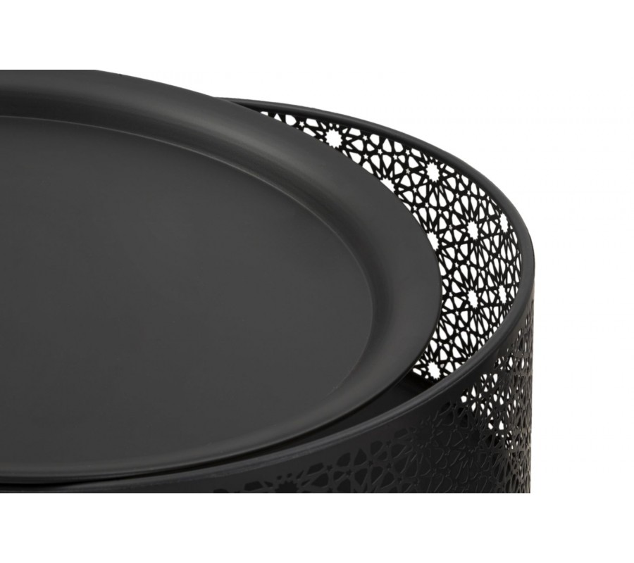 Vrchná doska má okrúhly tvar a je vyrobená z kovu s čiernou matnou povrchovou úpravou. Je odnímateľná, vďaka čomu stolík ponúka úložný priestor, ideálny na odkladanie dekorácií či osobných predmetov. Jemne vyvýšený okraj dosky zaisťuje jednoduchú manipuláciu a zároveň vizuálne zvýrazňuje jej elegantný tvar.