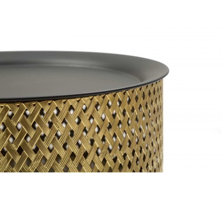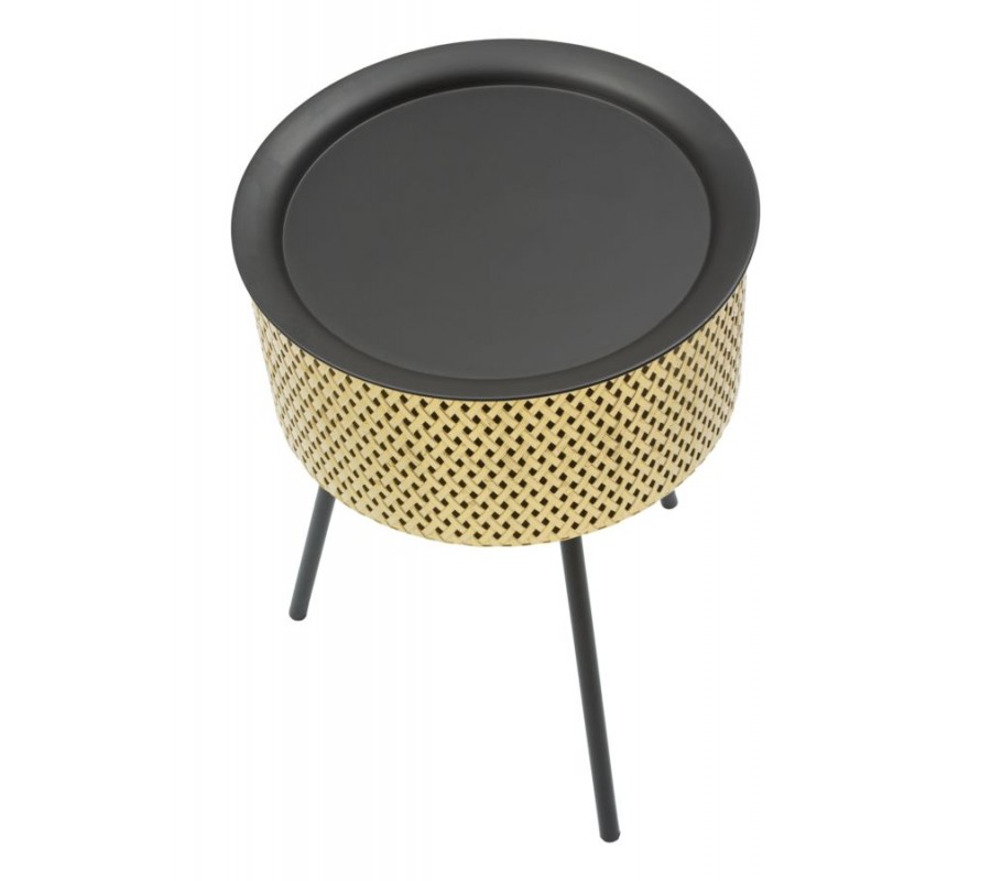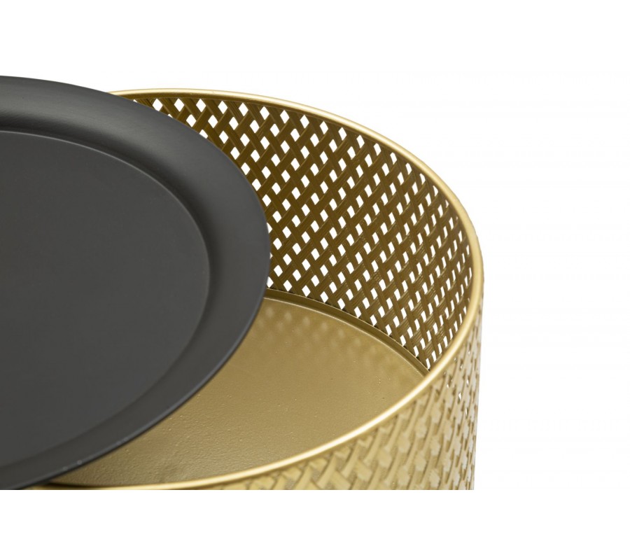 Okrúhla vrchná doska s matnou čiernou povrchovou úpravou je odnímateľná, čím slúži ako poklop od úložného priestoru. Jemne vyvýšený okraj pridáva zaujímavý vizuálny detail, zároveň zabezpečuje jednoduchú manipuláciu a zabraňuje zosunutiu menších predmetov z povrchu stolíka.