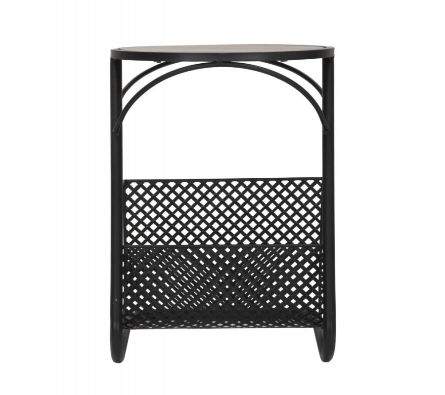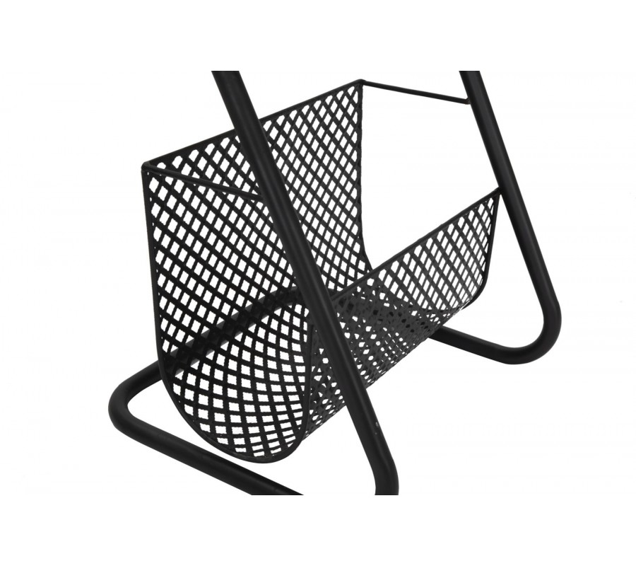 Kovová konštrukcia sa skladá z ohýbanej tyče, ktorá tvorí nohu stolíka a svojím tvarom zabezpečuje maximálnu stabilitu. Oblúkovité vzpery podporujú pevnosť a dodávajú stolíku vizuálnu ľahkosť. Integrovaný stojan na časopisy je tvorený perforovanou kovovou priehradkou s kosoštvorcovým vzorom, ktorý umožňuje odkladanie kníh, novín alebo dokumentov a zároveň esteticky dopĺňa celkový dizajn.