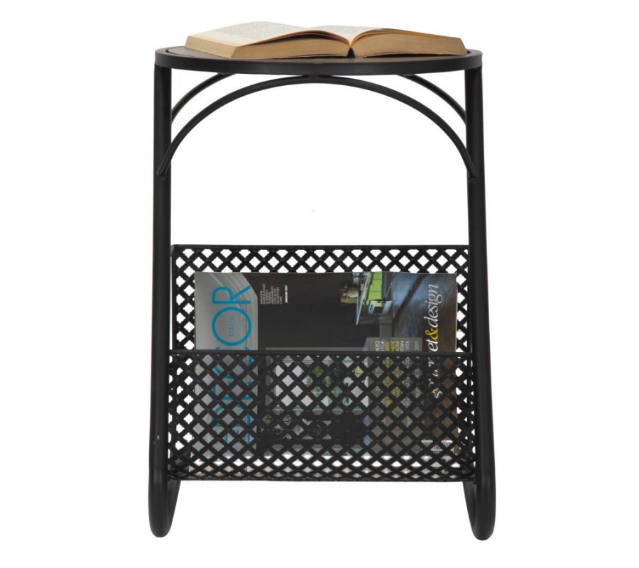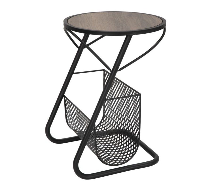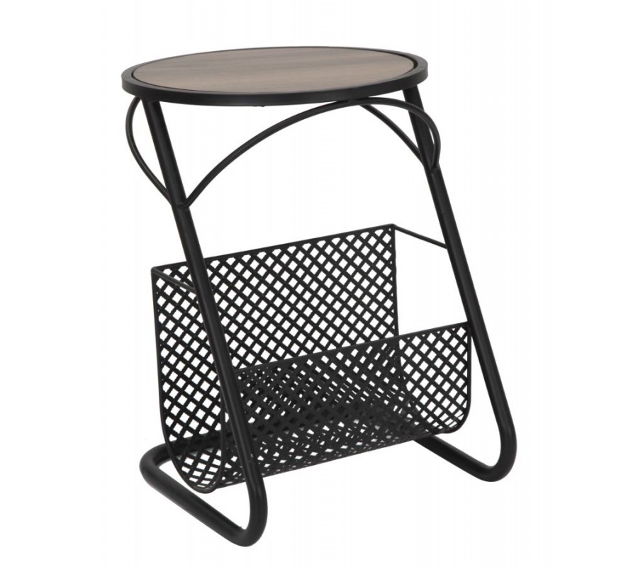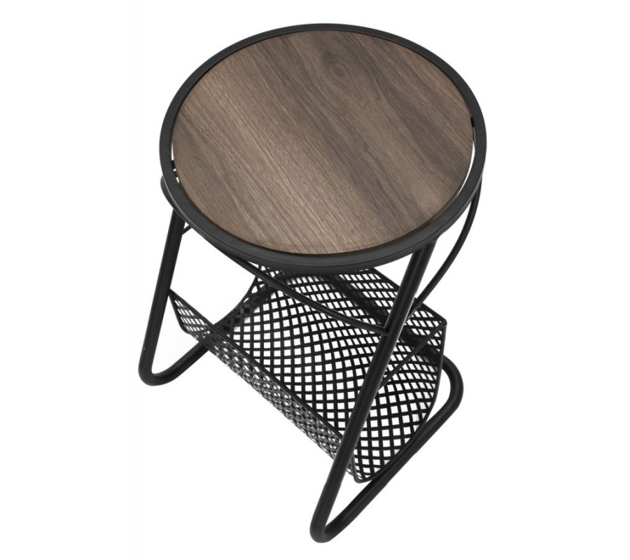 Industriálny príručný stolík so stojanom na časopisy Lennox z kovu v čiernej farbe s okrúhlou drevenou hnedou doskou 50 cm