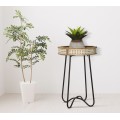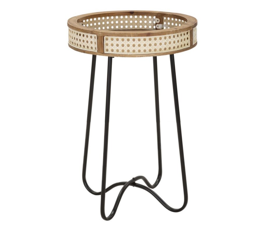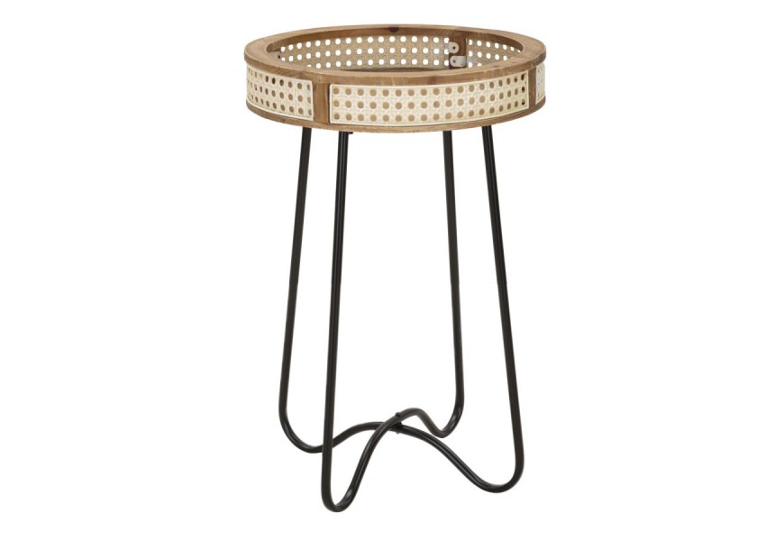Etno okrúhly ratanový hnedý príručný stolík Aran s viedenským výpletom s kovovými čiernymi nožičkami 60 cm