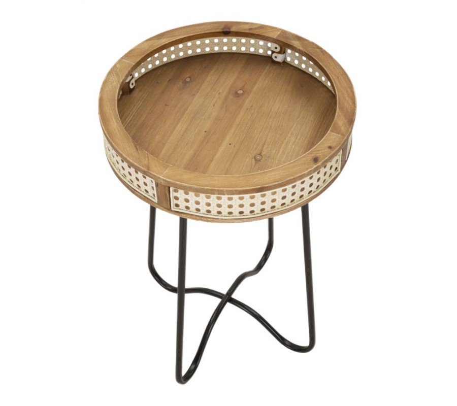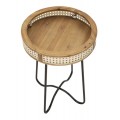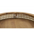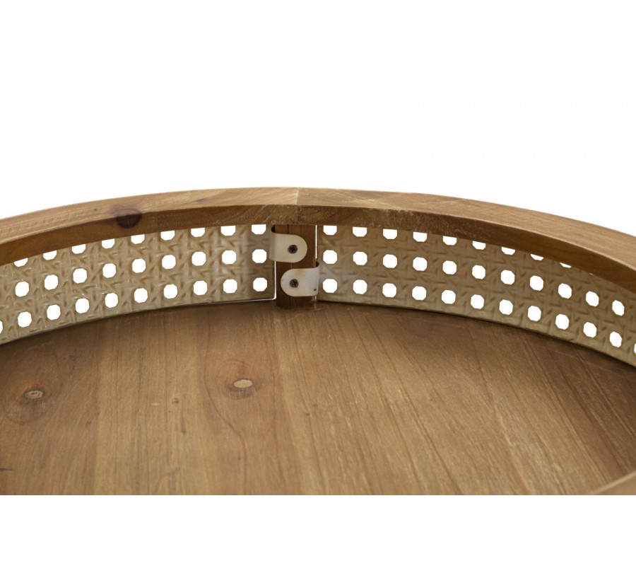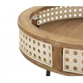 Okrúhly príručný stolík Aran v etno štýle kombinuje prírodné materiály s modernými prvkami. Vrchná časť je vyrobená z ratanu s viedenským výpletom v svetlohnedej farbe, ktorý dodáva vzdušnosť a remeselný charakter. Na krajoch je doplnený dreveným rámom, ktorý vytvára vyvýšený okraj, vďaka čomu je praktický a zároveň štýlový. Vhrcná doska je tiež z dreva.