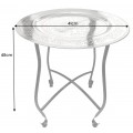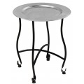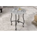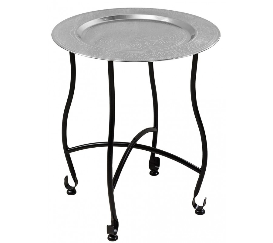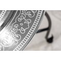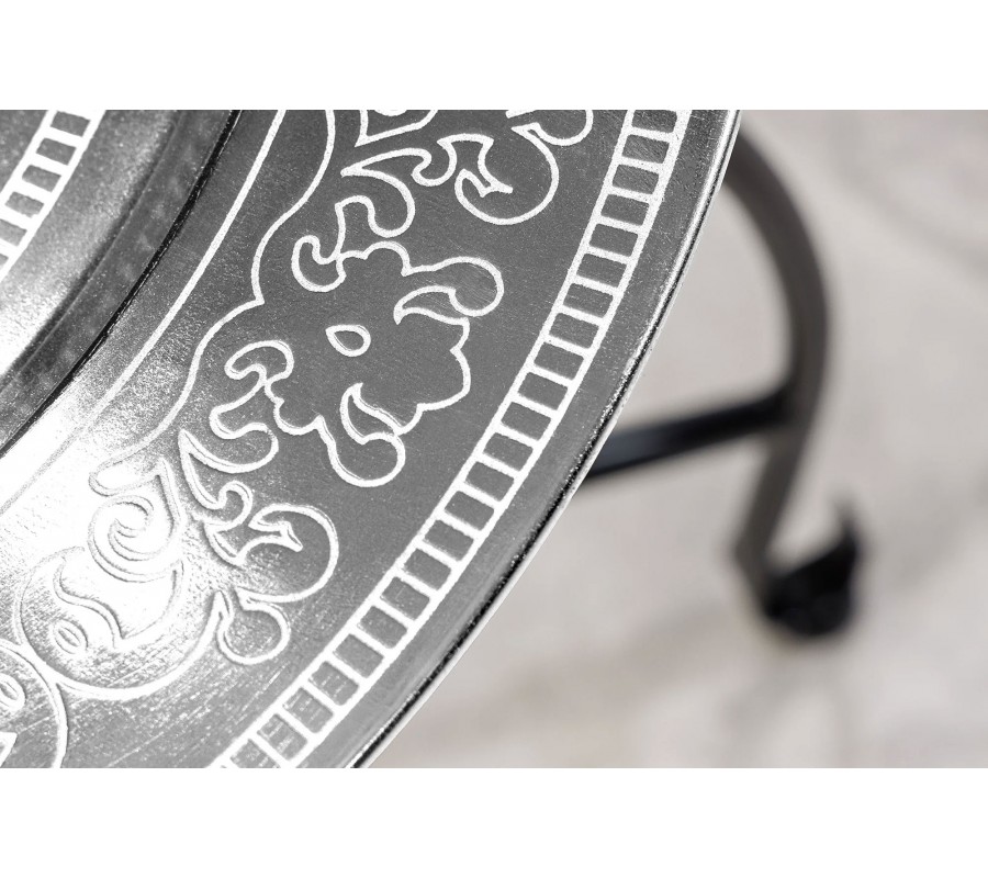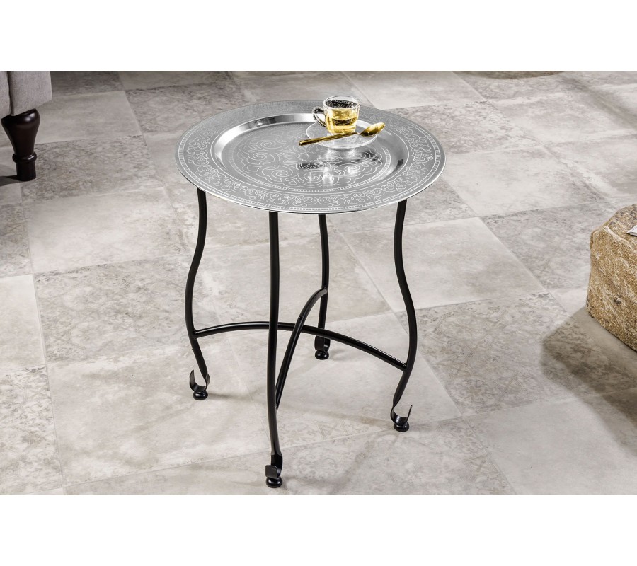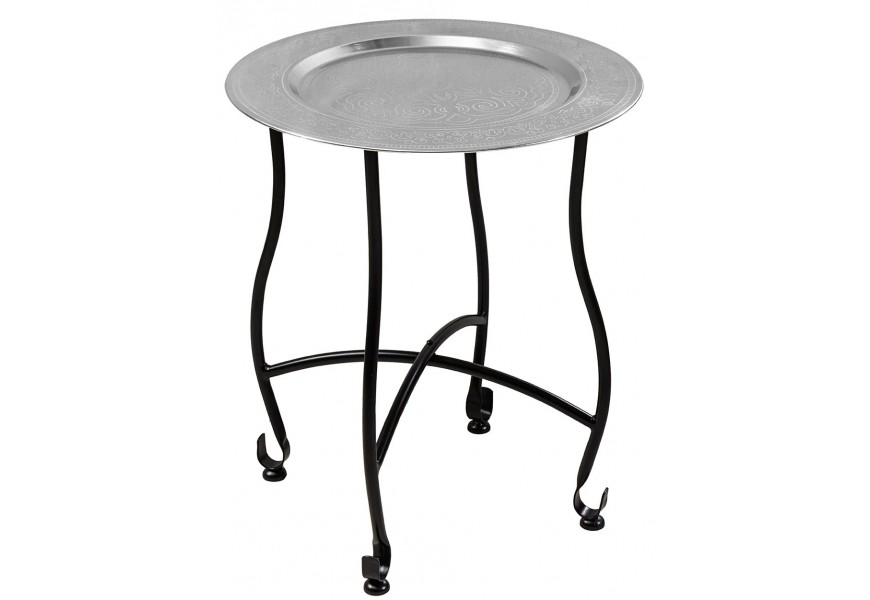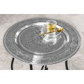 Dizajnový etno okrúhly príručný stolík Malik so striebornou doskou s ornamentmi a čiernou kovovou podstavou 48 cm