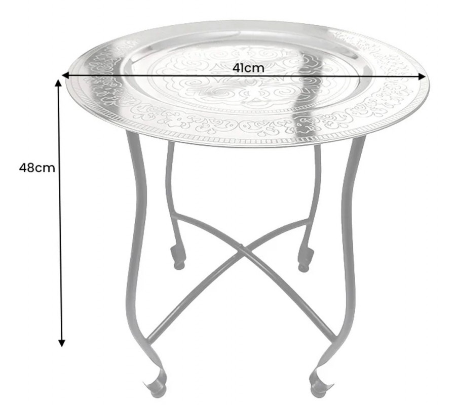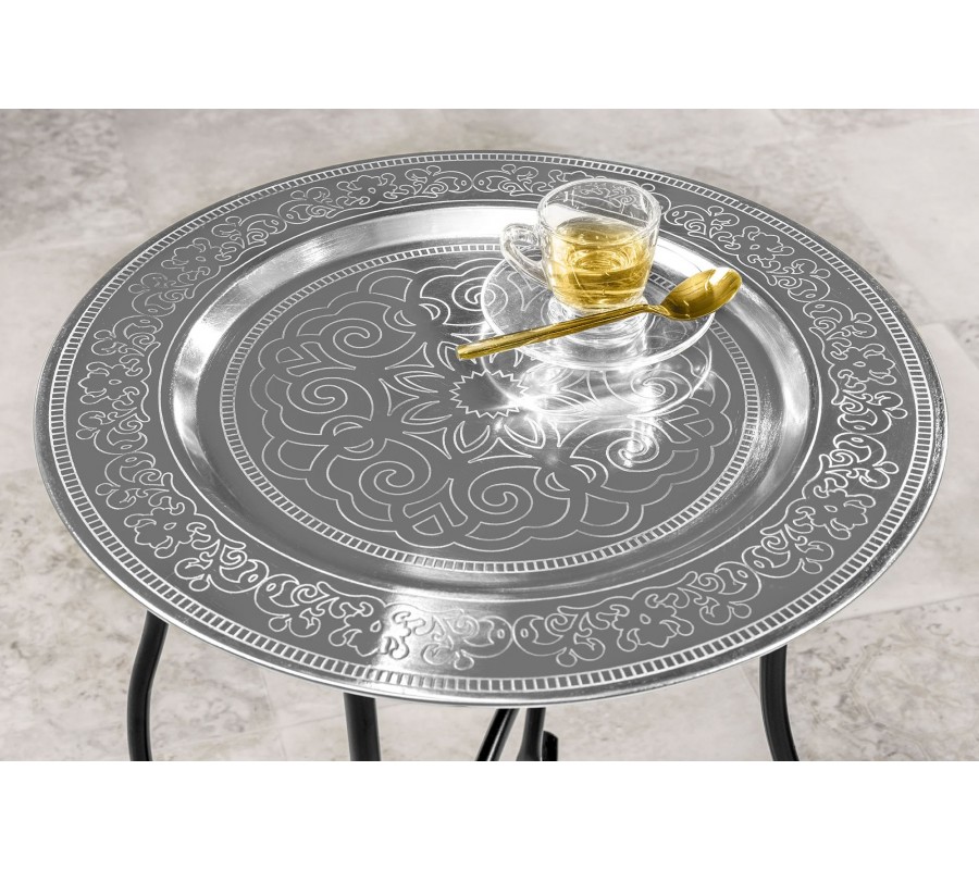 Okrúhly príručný stolík Malik v orientálnom štýle zaujme prepracovanými detailmi a ručne zdobeným dizajnom. Vrchná doska je vyhotovená zo strieborného kovu a pripomína svojím tvarom podnos. Povrch zdobia detailne vyryté ornamenty s tradičnými vzormi – v strede sa nachádza symetrická rozeta, z ktorej vychádzajú dekoratívne oblúky a prepletené línie s jemnými kvetinovými motívmi po obvode. Okraj dosky je mierne vyvýšený, čo zvýrazňuje jej estetiku a praktickosť.