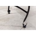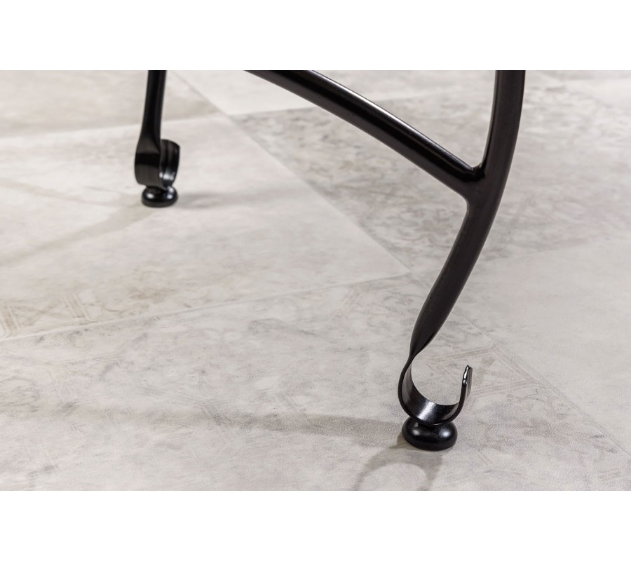 Podstava je z čierneho kovu, pričom jej štíhle zahnuté nohy dodávajú stolíku elegantný a tradičný vzhľad. Špecifickým prvkom je prekrížený kovový spoj medzi nohami, ktorý zvyšuje stabilitu a zároveň dopĺňa orientálny charakter nábytku. Zahnuté zakončenia nôh pridávajú jedinečný dekoratívny prvok a ladia s prepracovanou vrchnou časťou.