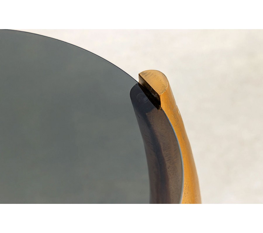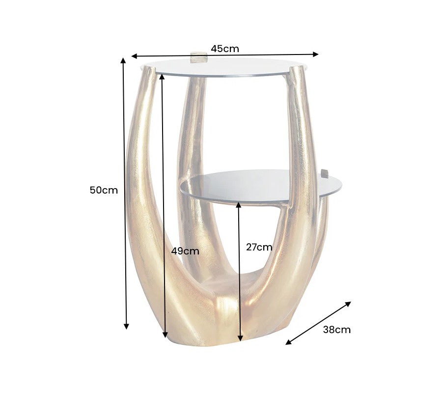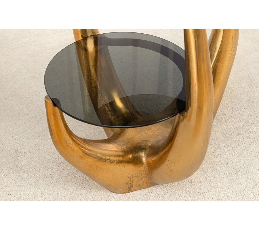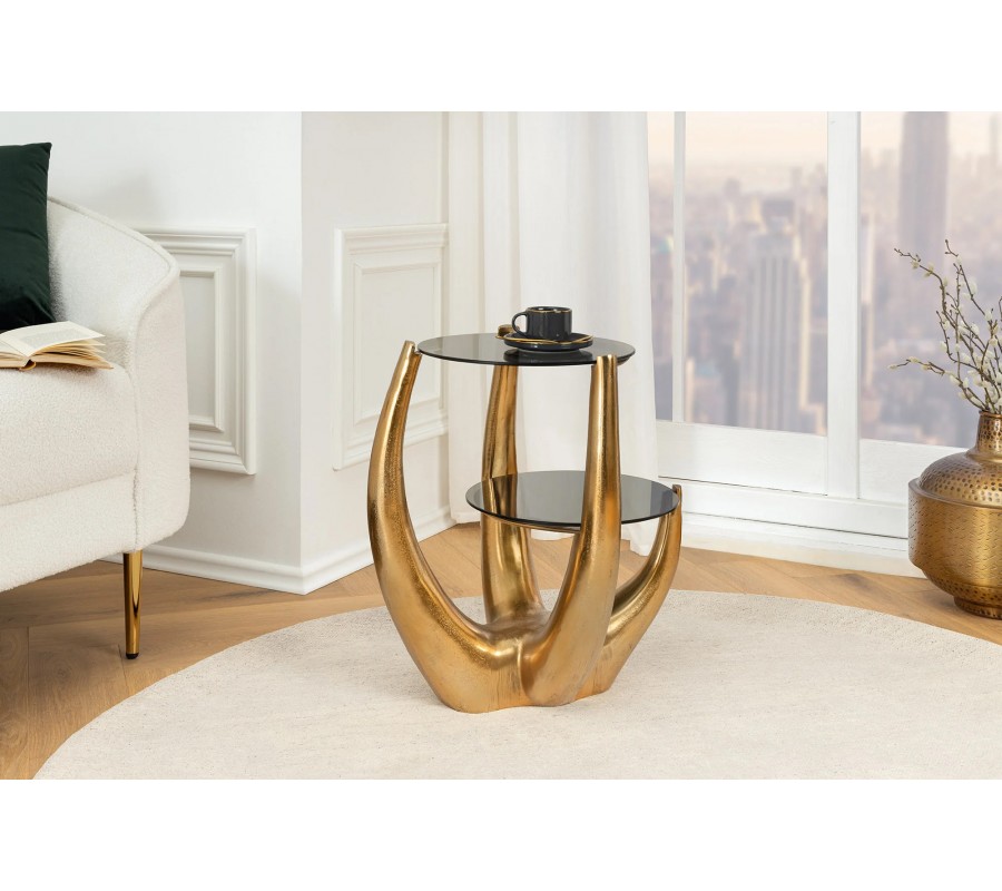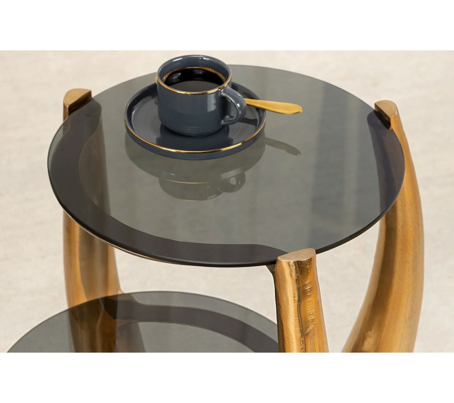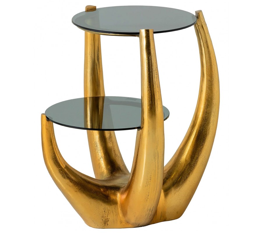 Dvojitý ručne vyrábaný príručný stolík Kalan je luxusný glamour kúsok, ktorý vyniká originálnym dizajnom a sochárskou estetikou. Jeho nápaditá kovová noha v zlatej farbe má organický, dynamický tvar, pripomínajúci rohy, parohy alebo abstraktné vetvy, ktoré sa smerom nahor rozvetvujú a elegantne podopierajú dve sklenené dosky s zadymeným efektom.