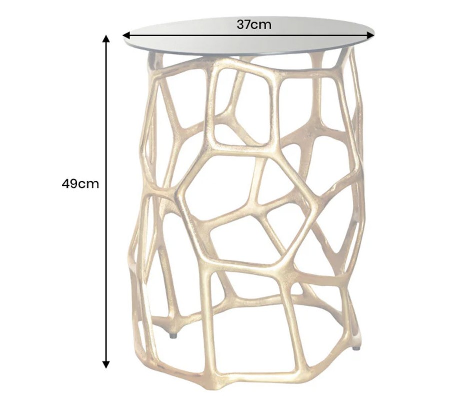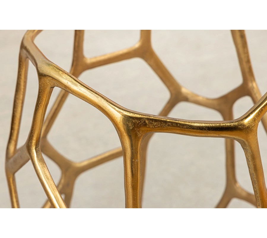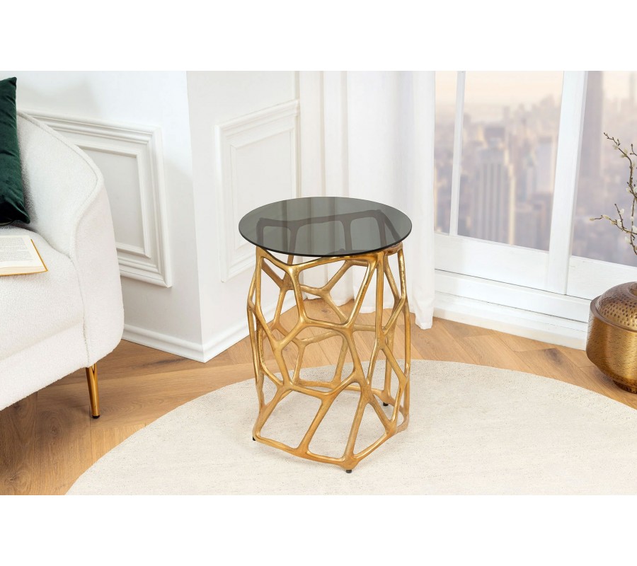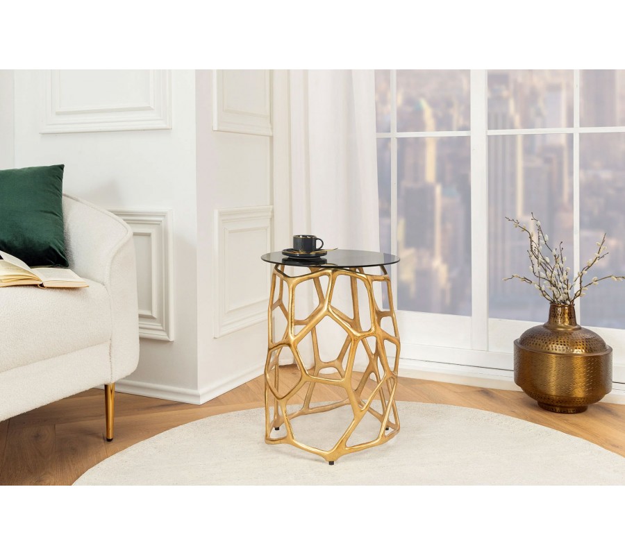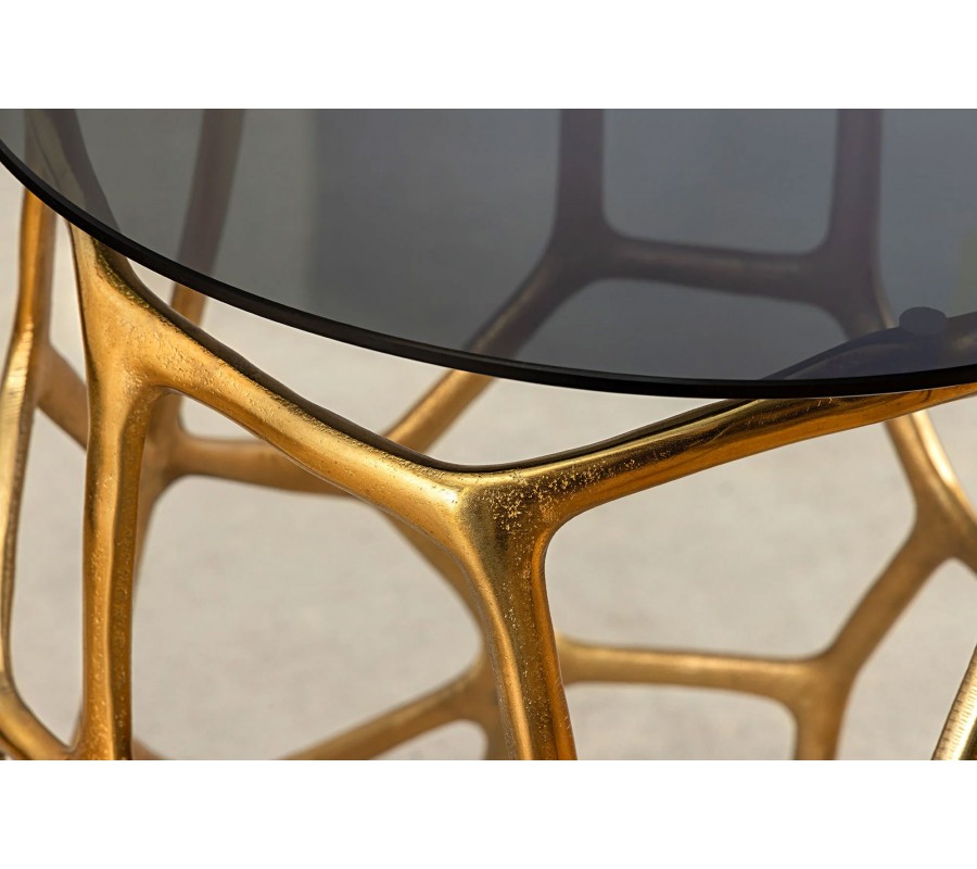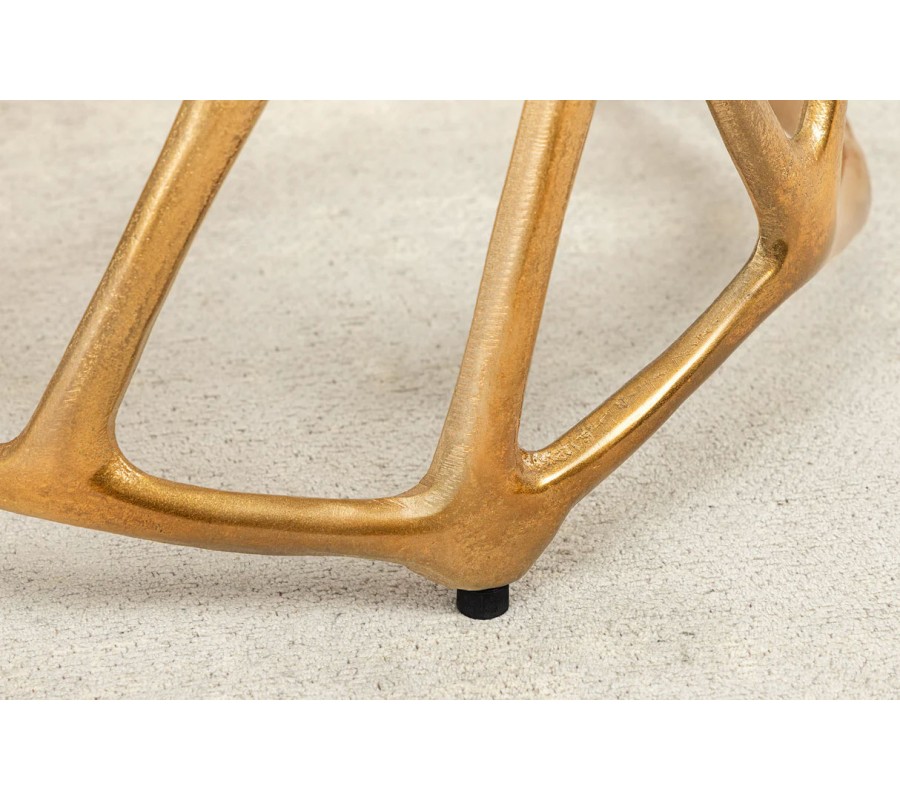 Glamour ručne vyrábaný príručný stolík Kalan v okrúhlom tvare zaujme svojou dizajnovou kovovou nohou v zlatej farbe, ktorá má otvorenú perforovanú štruktúru tvorenú organickými prepojenými tvarmi, pripomínajúcimi bunkovú štruktúru alebo vetvenie prírodných útvarov. Táto abstraktná geometrická konštrukcia vytvára vzdušný dojem, pričom spodná časť stolíka sa zakončuje nerovnomerne, čím pôsobí sochársky a dynamicky. Stabilitu mu zabezpečujú drobné podložky, ktoré vyrovnávajú jeho netradičný dizajn.