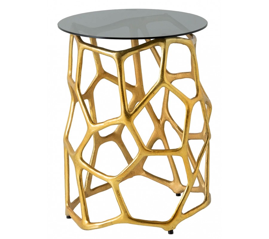 Glamour okrúhly kovový príručný stolík Kalan so zlatou perforovanou nohou a vrchnou sklenenou sivou doskou 49 cm