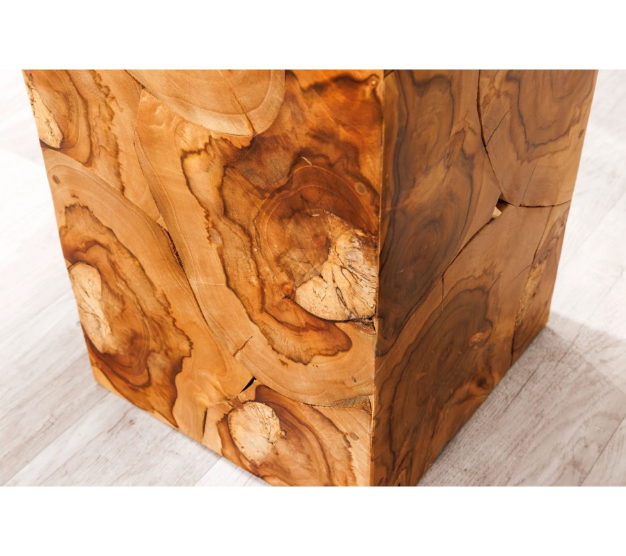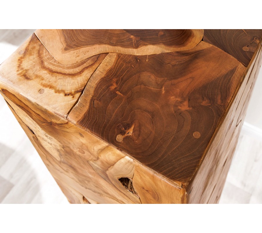 Dizajnový podstavec Atlas sa pýši mohutným kvádrovým tvarom s precízne opracovanými hranami, ktoré mu dodávajú stabilitu a výraznú estetiku. Povrch je vytvorený zo starostlivo poskladaných kúskov masívneho teakového dreva, pričom každá strana odhaľuje jedinečnú prírodnú kresbu s charakteristickými letokruhmi, prírodnými prasklinami a nepravidelnými výrezmi v štruktúre dreva. Kombinácia ručného spracovania a organického charakteru dreva zaručuje, že je každý kus originálom s jedinečnou kresbou prirodzenými nepravidelnosťami.