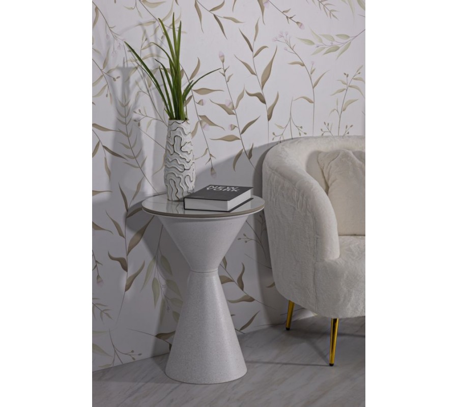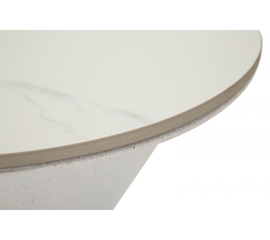 Dizajnový príručný stolík Edal v minimalistickom štýle s mramorovým vzhľadom kombinuje moderné materiály a čisté línie. Vrchná doska je v okrúhlom tvare v bielo sivej farbe s jemnými sivými žilkami, ktoré imitujú prírodný mramor. Hrany dosky sú hladko opracované a plynule nadväzujú na základňu.