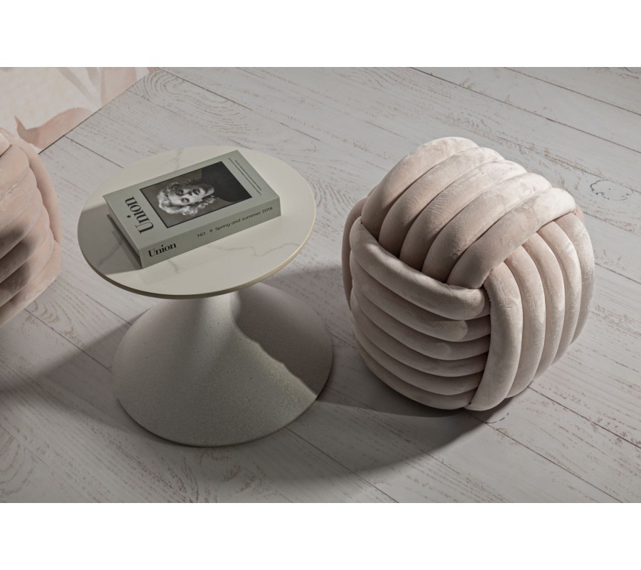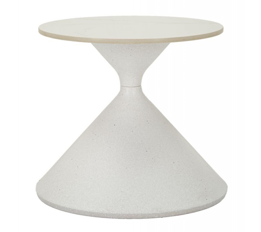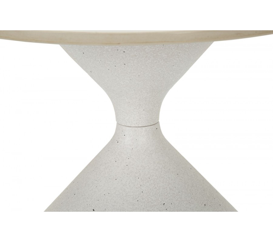 Dizajnový príručný stolík Edal v minimalistickom štýle vyniká elegantným mramorovým vzhľadom v bielo sivej farbe. Vrchná doska je hladká, s jemným žilkovaním, v okrúhlom tvare. Pod doskou je viditeľný spoj dvoch častí konštrukcie. Nohu, s kovovou výplňou, tvoria dve kužeľové časti, ktoré spoločne vytvárajú tvar presýpacích hodín. Povrch nohy je štruktúrovaný, s jemným zrnením, čo dodáva stolíku jedinečný hmatový i vizuálny efekt.