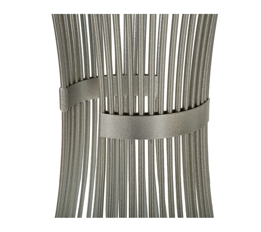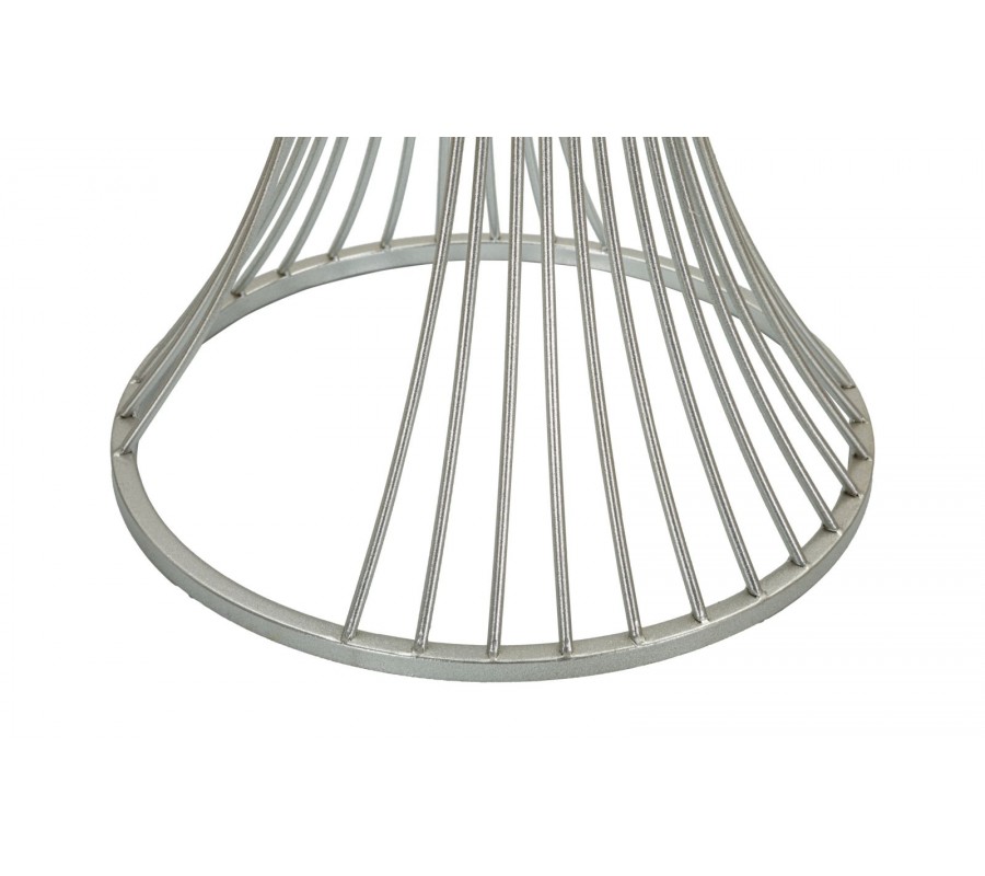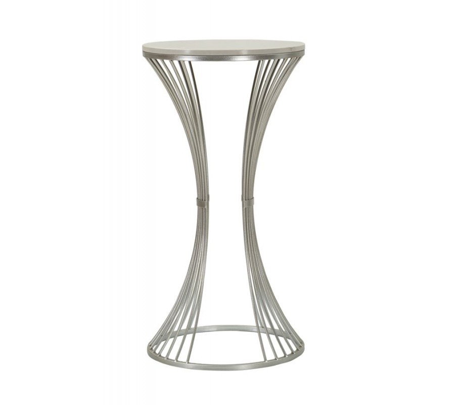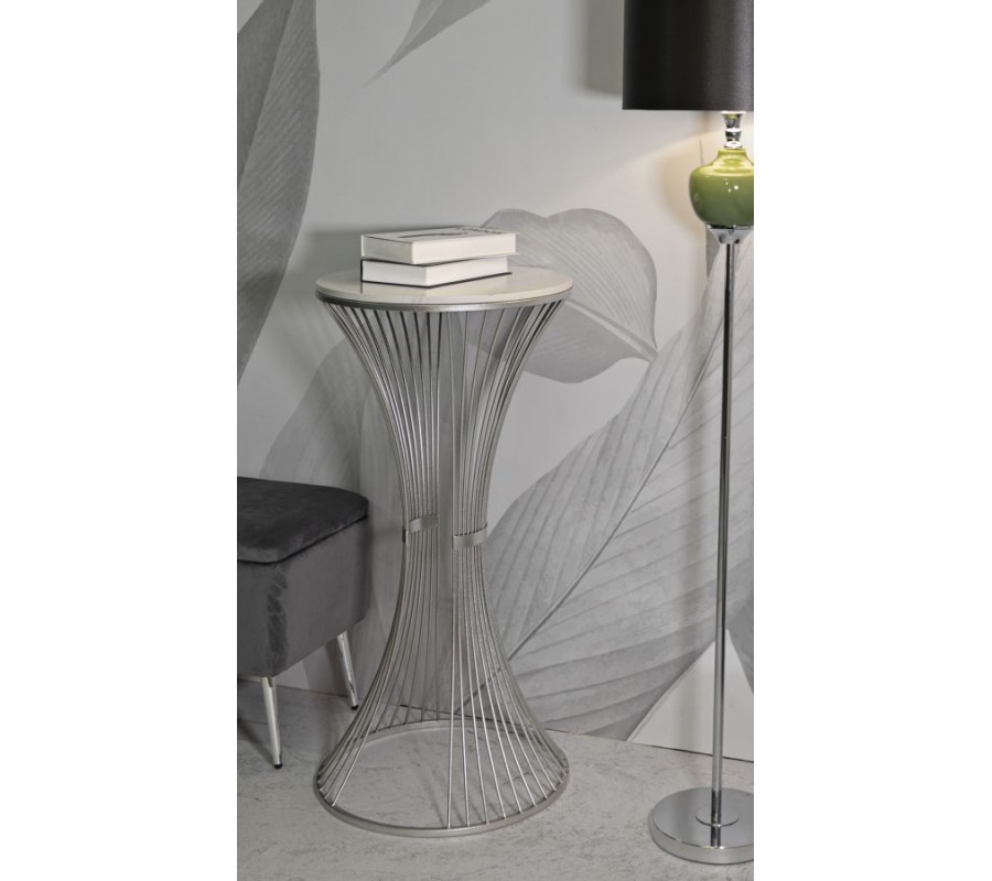 Príručný stolík Nelia v striebornej farbe vnáša do interiéru elegantný art deco a glamour štýl. Jeho konštrukcia je vyrobená z tenkých kovových tyčí, ktoré sú nahusto uložené po bokoch stolíka, vďaka čomu sa medzi týmito sekciami vytvára priestor. V strednej časti sa tyče mierne ohýbajú, čím vzniká tvar presýpacích hodín. Celú konštrukciu spevňuje spodný kruh, ktorý zabezpečuje stabilitu.