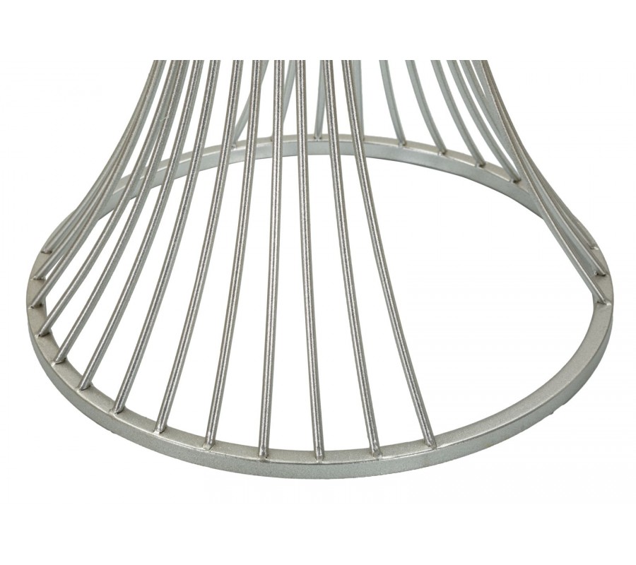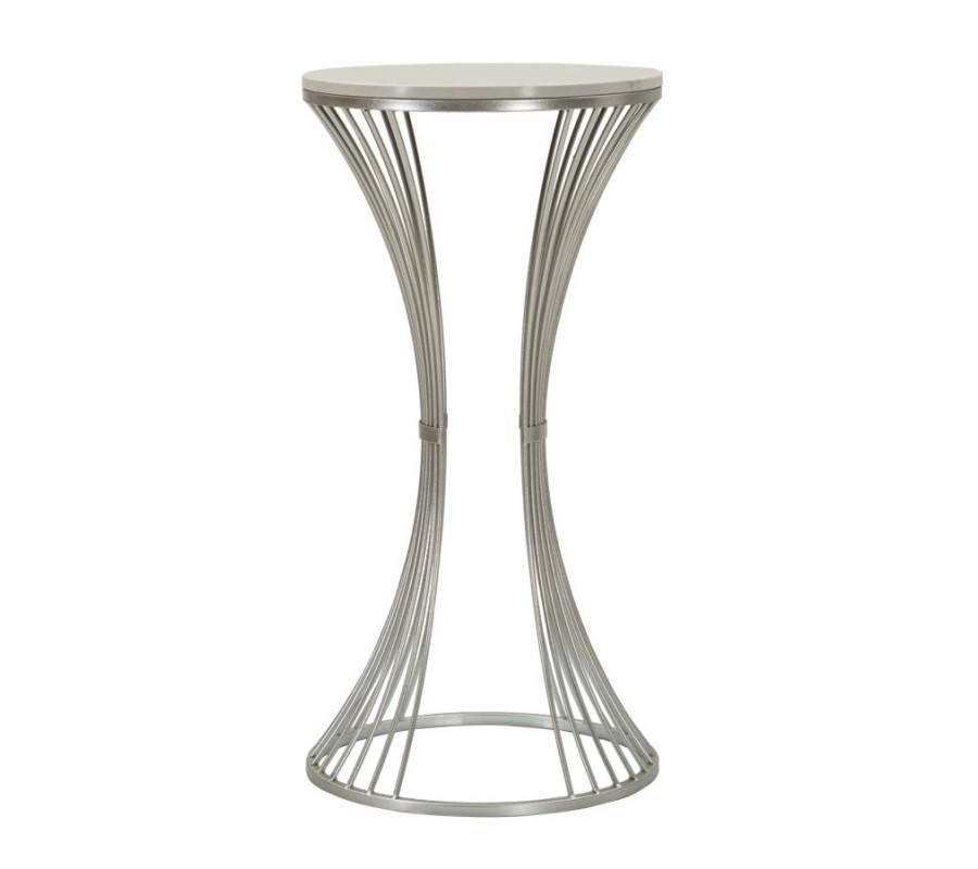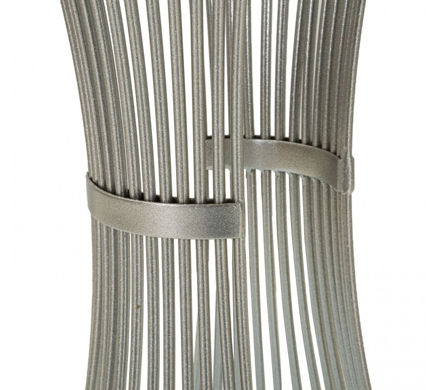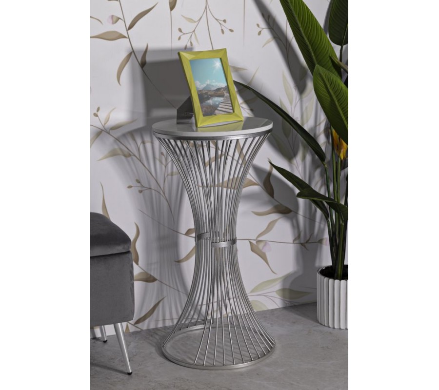 Príručný stolík Nelia v striebornej farbe vnáša do interiéru glamour a art deco štýl s elegantným nádychom. Jeho konštrukcia je tvorená tenkými kovovými tyčami, ktoré sú nahusto rozmiestnené po bokoch stolíka, čím medzi nimi vzniká otvorený priestor. Tyče sa v strednej časti jemne ohýbajú, čím vytvárajú tvar presýpacích hodín, pričom stabilitu celej konštrukcie zabezpečuje spodný kovový kruh.