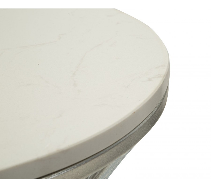 Vrchná doska je vyhotovená v okrúhlom tvare z mramoru v bielo sivej farbe so sivými žilkami, ktoré dodávajú luxusný vzhľad. Pre zvýšenú pevnosť je podložená MDF výstužou, na ktorej spočíva samotná mramorová vrstva.