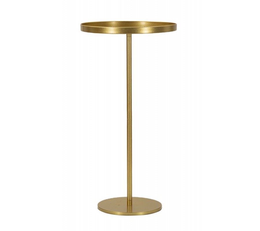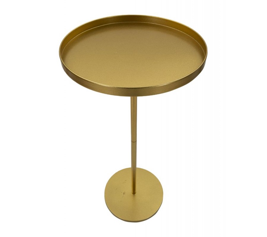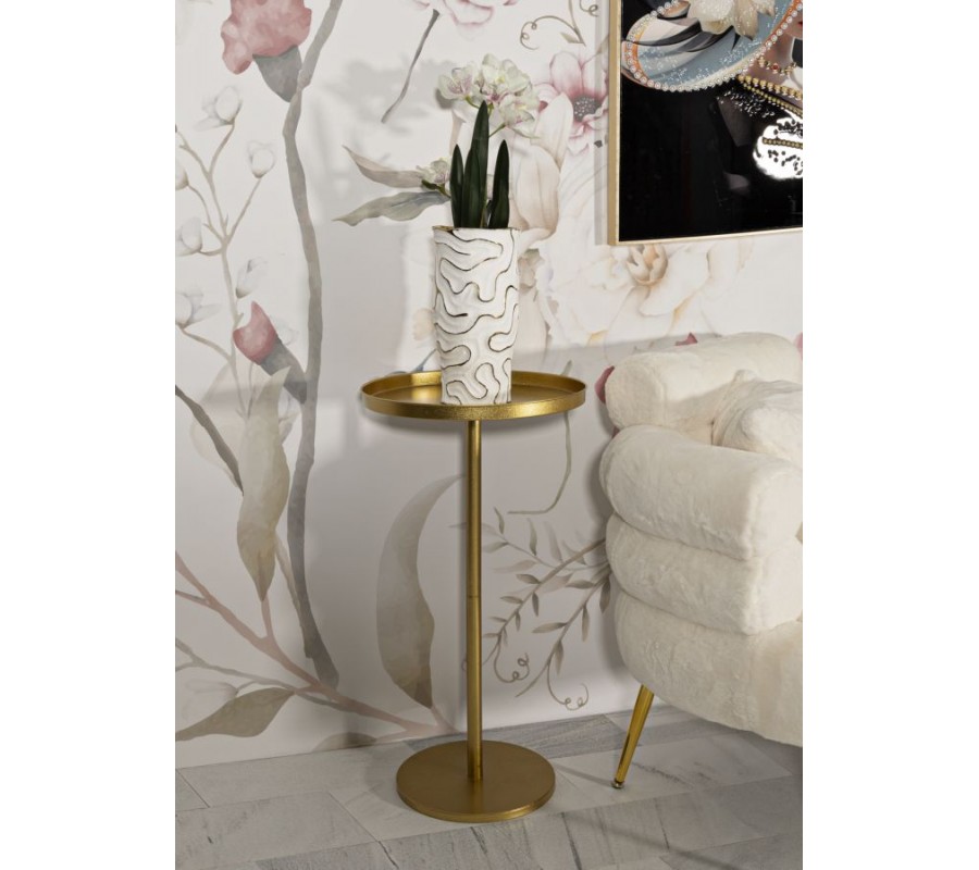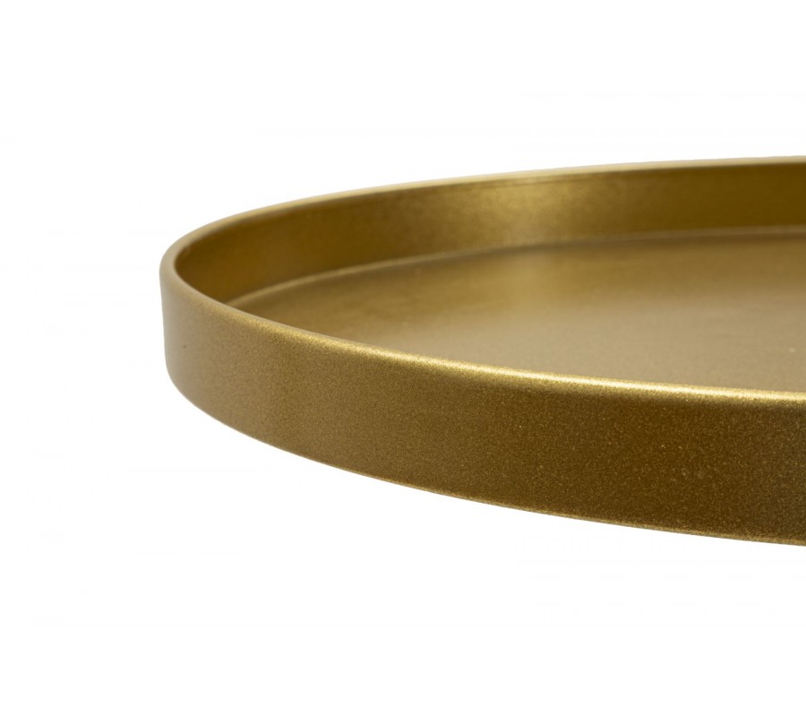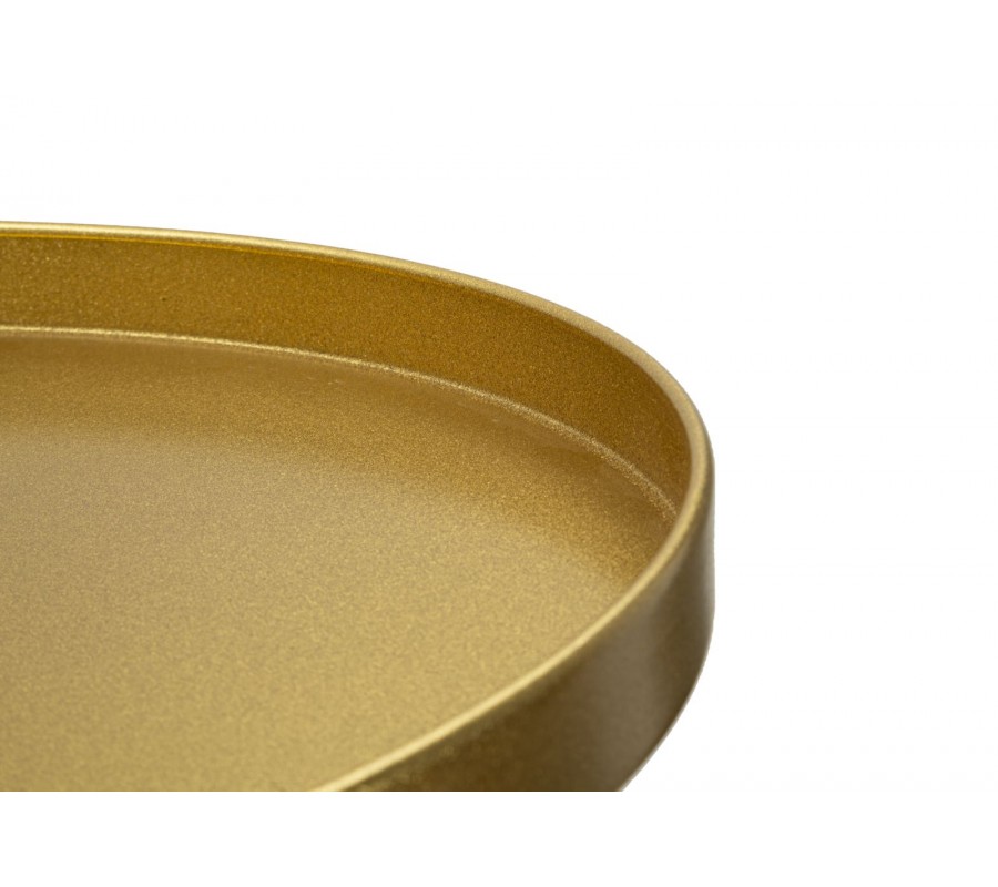 Art deco príručný stolík Relia v elegantnej zlatej farbe dodáva interiéru luxusný a nadčasový nádych. Jeho okrúhla vrchná doska s jemne vyvýšeným okrajom je vyrobená z kovu s hladkým a lesklým povrchom, čo mu dodáva sofistikovaný vzhľad.