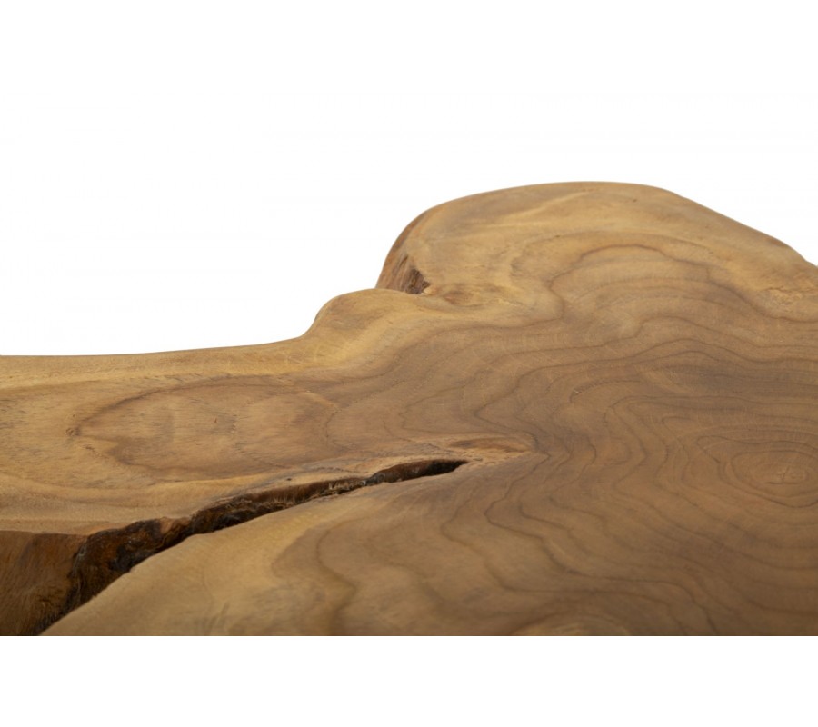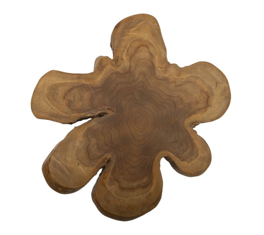 Vidiecka taburetka Tara je jedinečný prírodný kúsok vyrobený z masívneho teakového dreva v hnedej farbe s výraznou štruktúrou letokruhov. Sedacia doska má asymetrický organický tvar, ktorý pripomína surový prírodný kus dreva s jemne zvlnenými okrajmi. Každý kus je originálny, vďaka čomu má autentický vidiecky vzhľad.