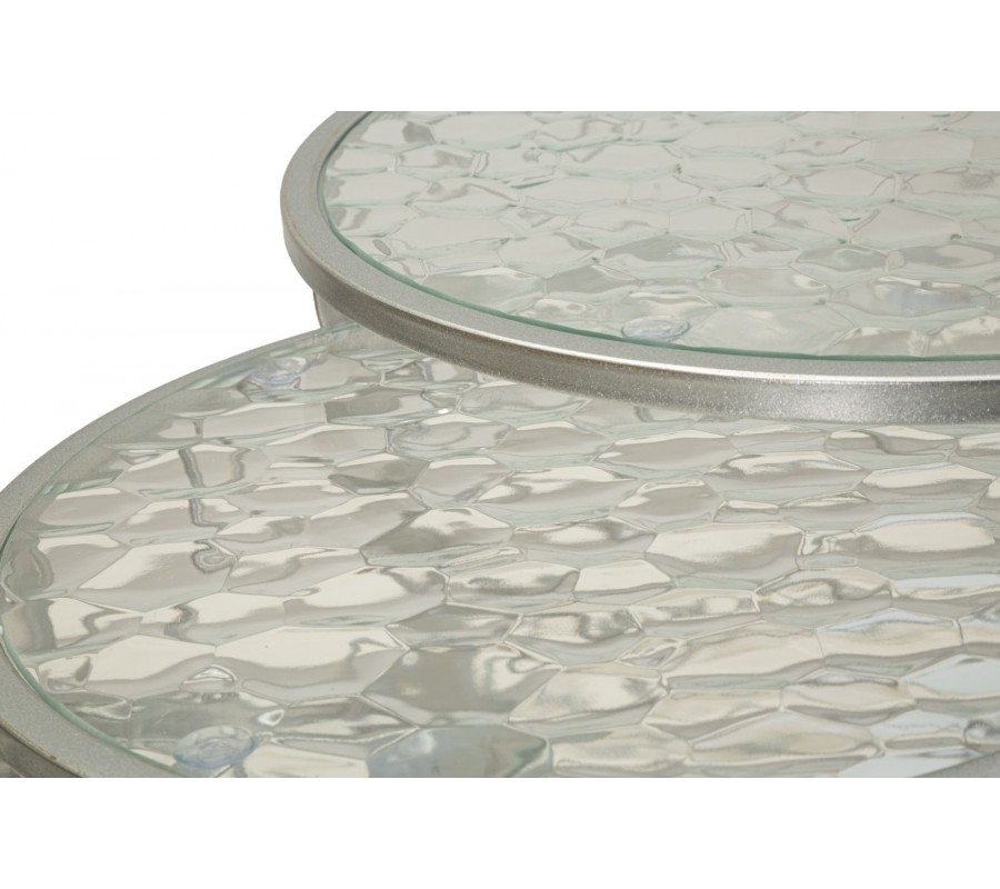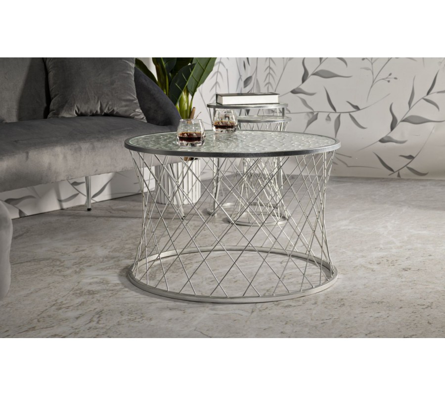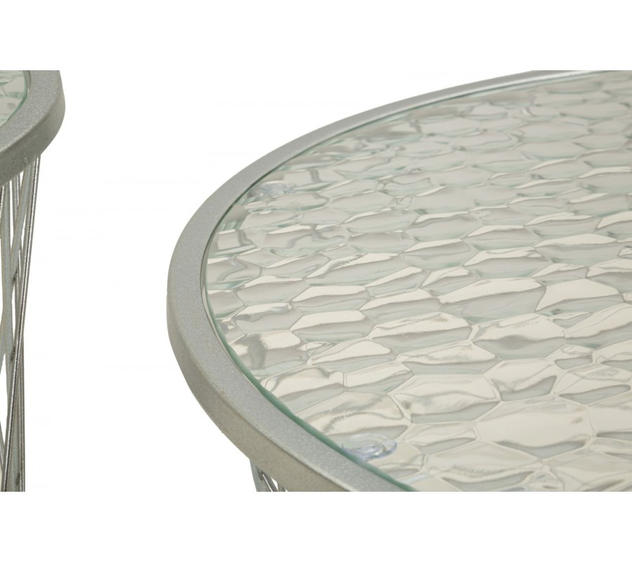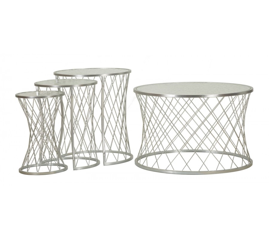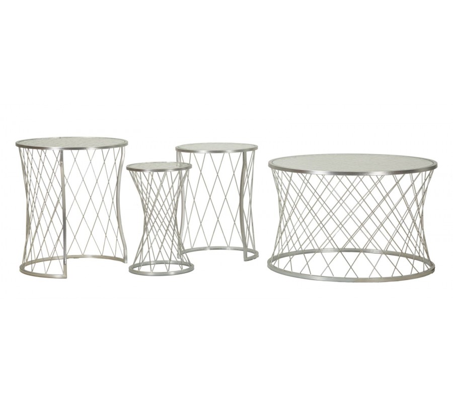 Set štyroch príručných stolíkov Deli v striebornej farbe je dizajnovým doplnkom s luxusným art deco a glamour štýlom. Každý stolík má kovovú nohu tvorenú z tenkých prepletených tyčí, ktoré sa krížia a tvoria elegantný kosoštvorcový vzor. Vrchné dosky sú zo štruktúrovaného jemne priehľadného skla, ktoré dodáva vzdušnosť a sofistikovaný vzhľad.