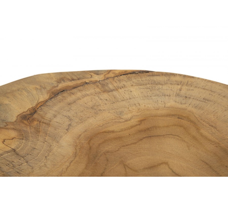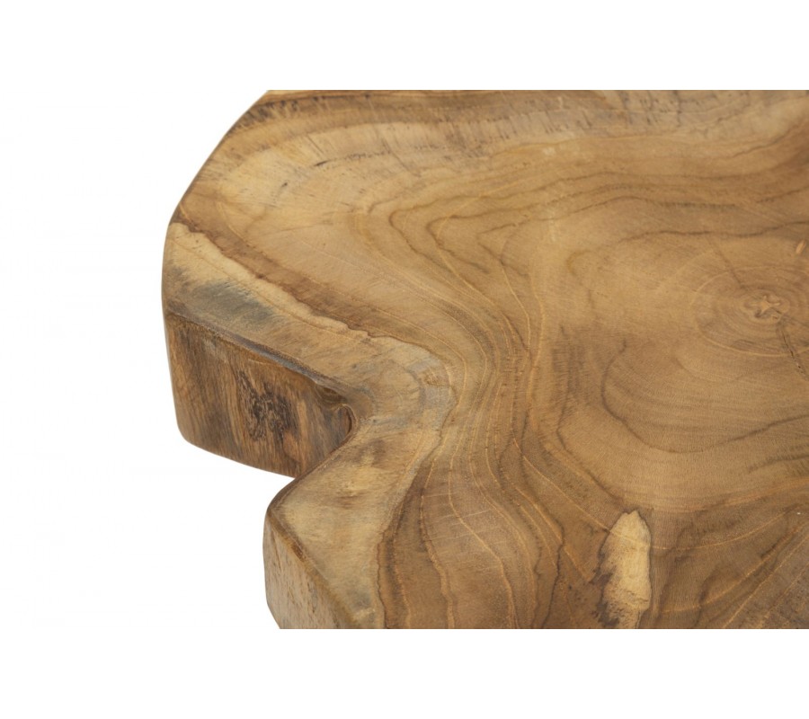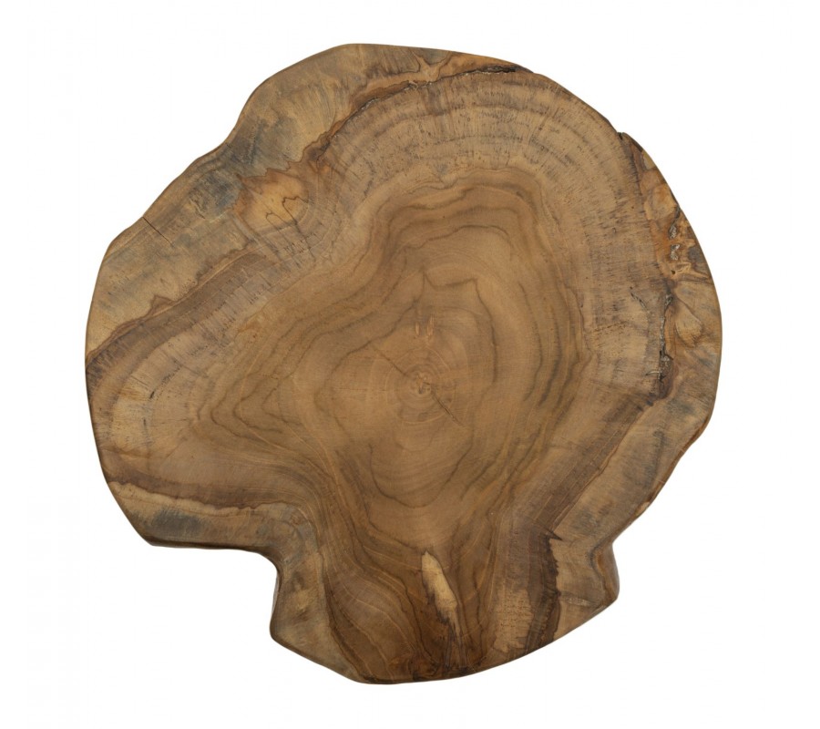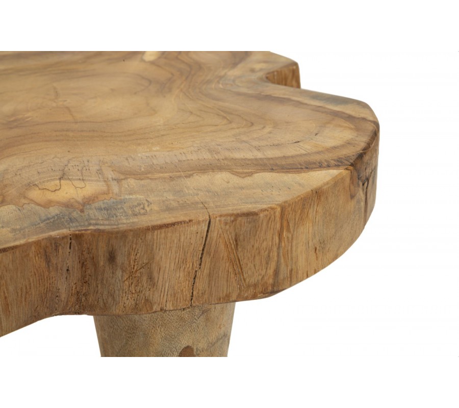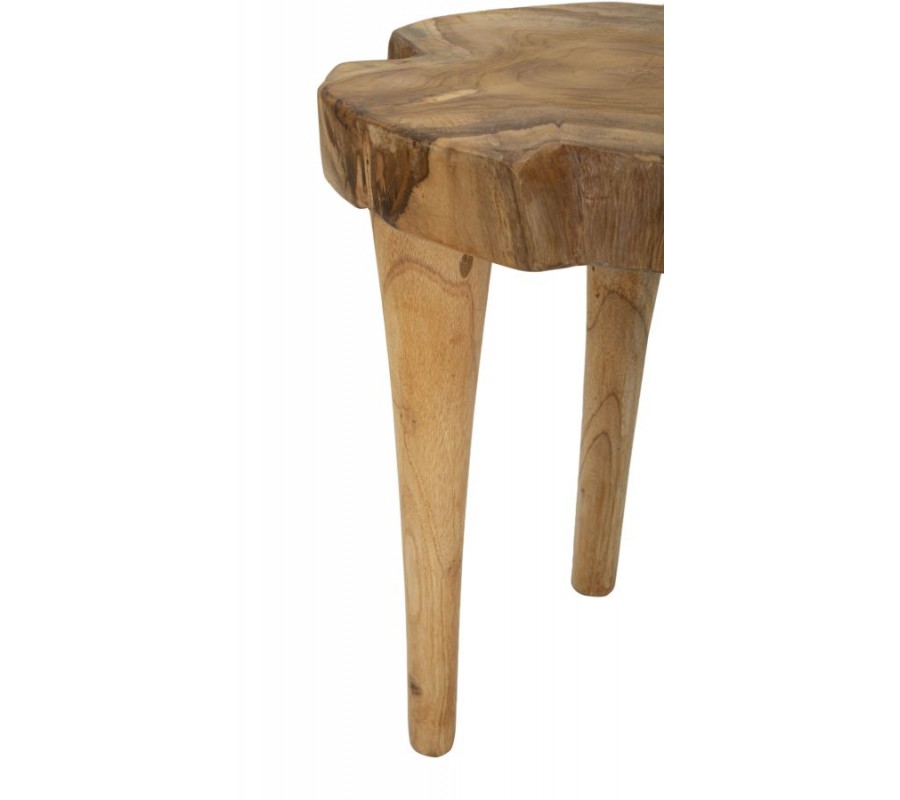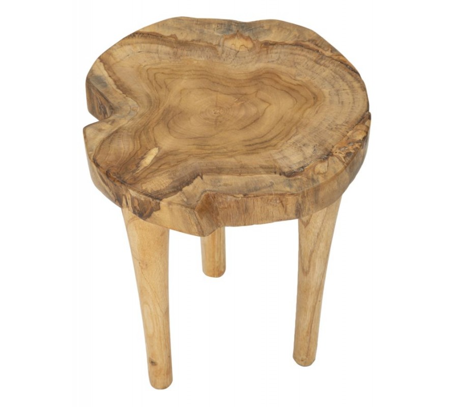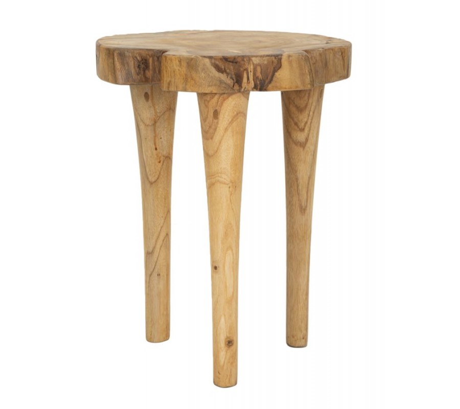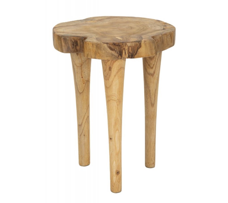 Taburetka Kolia je štýlový vidiecky doplnok s okrúhlou vrchnou doskou v nepravidelnom tvare, ktorý podčiarkuje prirodzený vzhľad dreva. Povrch v teplej hnedej farbe zvýrazňuje autentickú kresbu dreva s viditeľnými letokruhmi a jemnou textúrou. Tri stabilné nožičky majú na vrchu širší profil a smerom nadol sa mierne zužujú, čím dodávajú taburetke elegantný a zároveň pevný vzhľad.