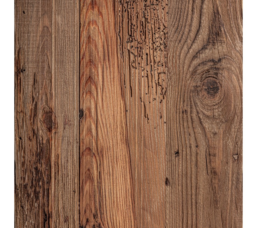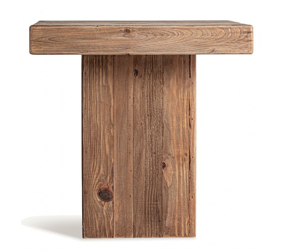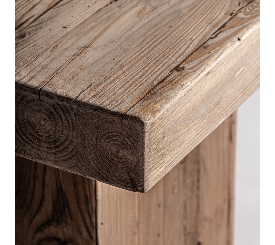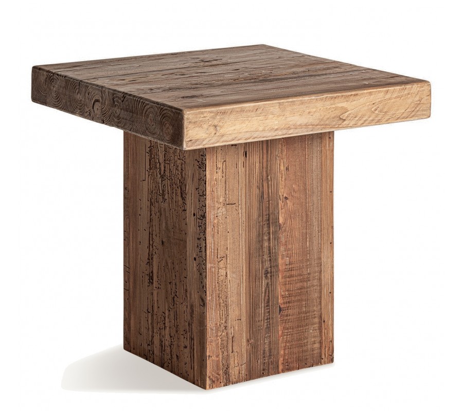 Luxusný príručný stolík Lilia v štvorcovom tvare s výrazným rustikálnym nádychom je vyrobený z masívneho recyklovaného dreva v hnedej farbe s prirodzenou drevenou textúrou a viditeľnými letokruhmi. Jeho robustná kvádrová noha dodáva stabilitu a zdôrazňuje surovú prírodnú krásu dreva, zatiaľ čo hrubá doska s autentickou kresbou dreva pôsobí masívne a exkluzívne.