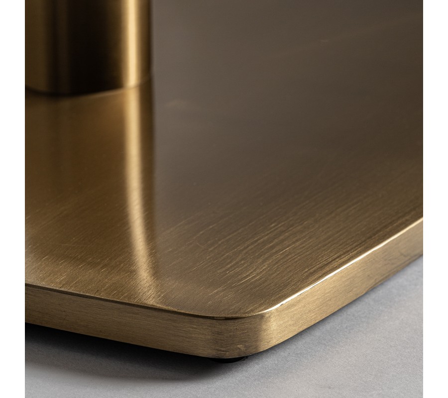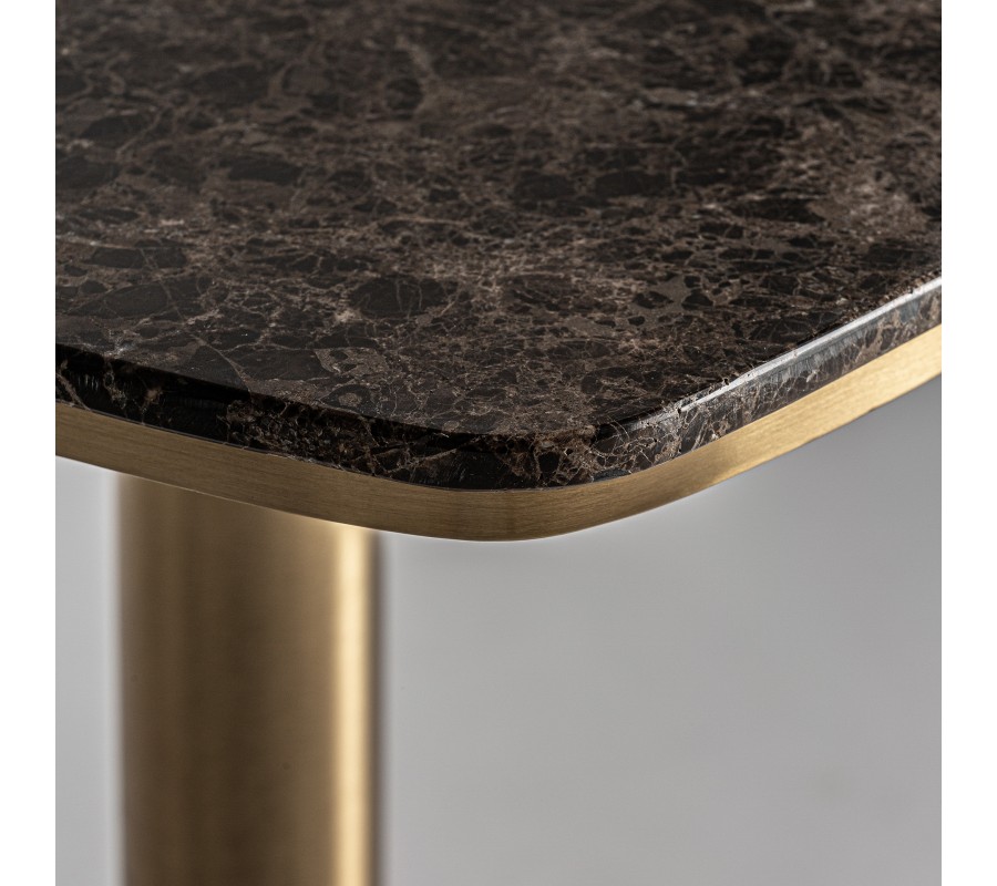 Luxusný príručný stolík Artis v glamour a art deco štýle v sebe spája eleganciu mramoru a sofistikovaný kovový dizajn. Vrchná doska v štvorcovom tvare je vyrobená z hnedo čierneho mramoru s jemnými bielymi žilkami, pričom jej zaoblené rohy dodávajú celkovému vzhľadu jemnosť a plynulosť. Lesklá kovová noha v zlatej farbe pôsobí exkluzívne a je pevne ukotvená na štvorcovej podstave, ktorá zaručuje stabilitu.