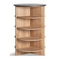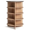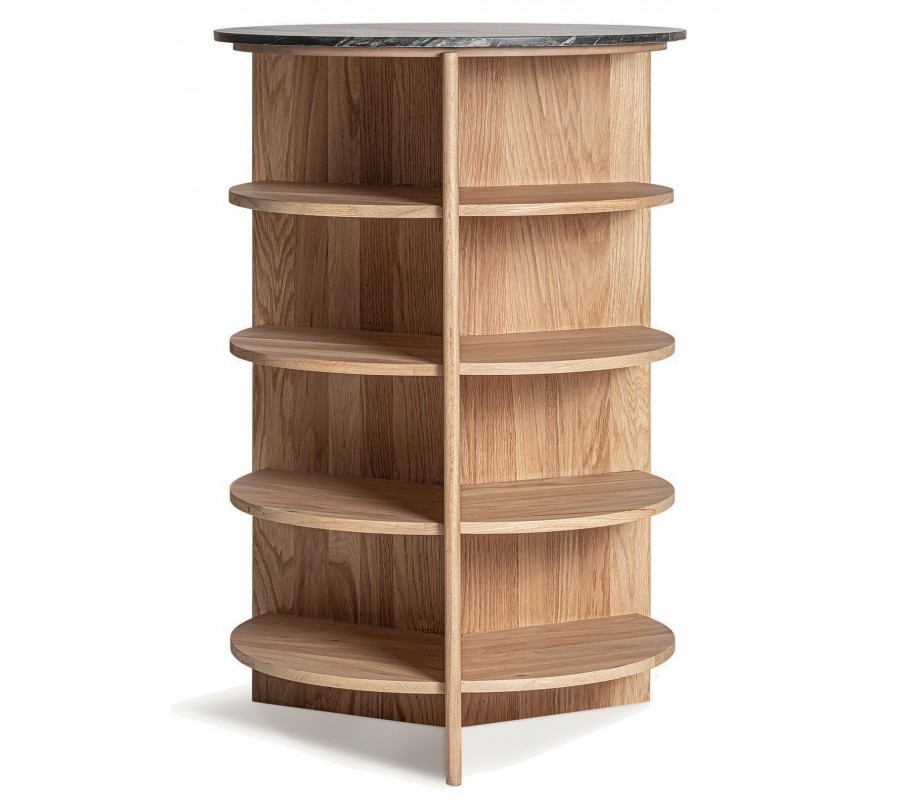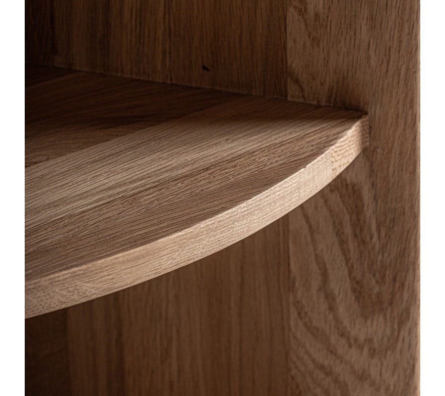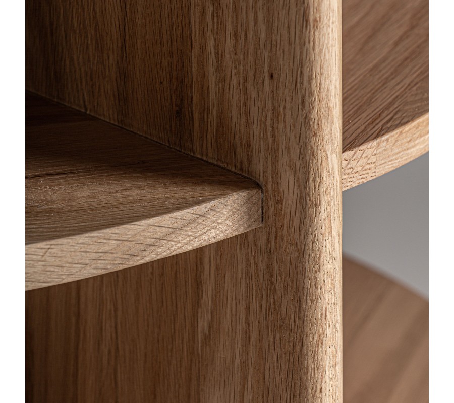 Luxusný škandinávsky príručný stolík Naria v okrúhlom tvare ponúka nielen dizajnovú eleganciu, ale aj praktické riešenie úložného priestoru. Jeho konštrukcia je rozdelená na tri sekcie, pričom každá obsahuje štyri poličky, spolu tak stolík ponúka dvanásť úložných priečinkov. Vyrobený je z dubového masívneho dreva v hnedej farbe s výraznou kresbou letokruhov, ktorá dodáva nábytku prirodzený charakter.