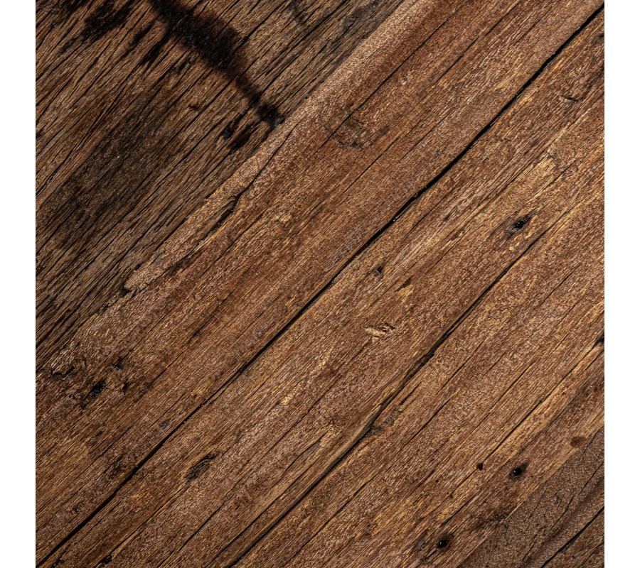 Vrchná doska je vyrobená z masívneho dreva v tmavohnedom odtieni, pričom na jej povrchu možno pozorovať viditeľné letokruhy, praskliny, drobné uzly a jemné nerovnosti, ktoré vznikajú vďaka zachovaniu surovej štruktúry materiálu. Každý kus je ručne opracovaný, čo zaručuje jeho jedinečný vzhľad.