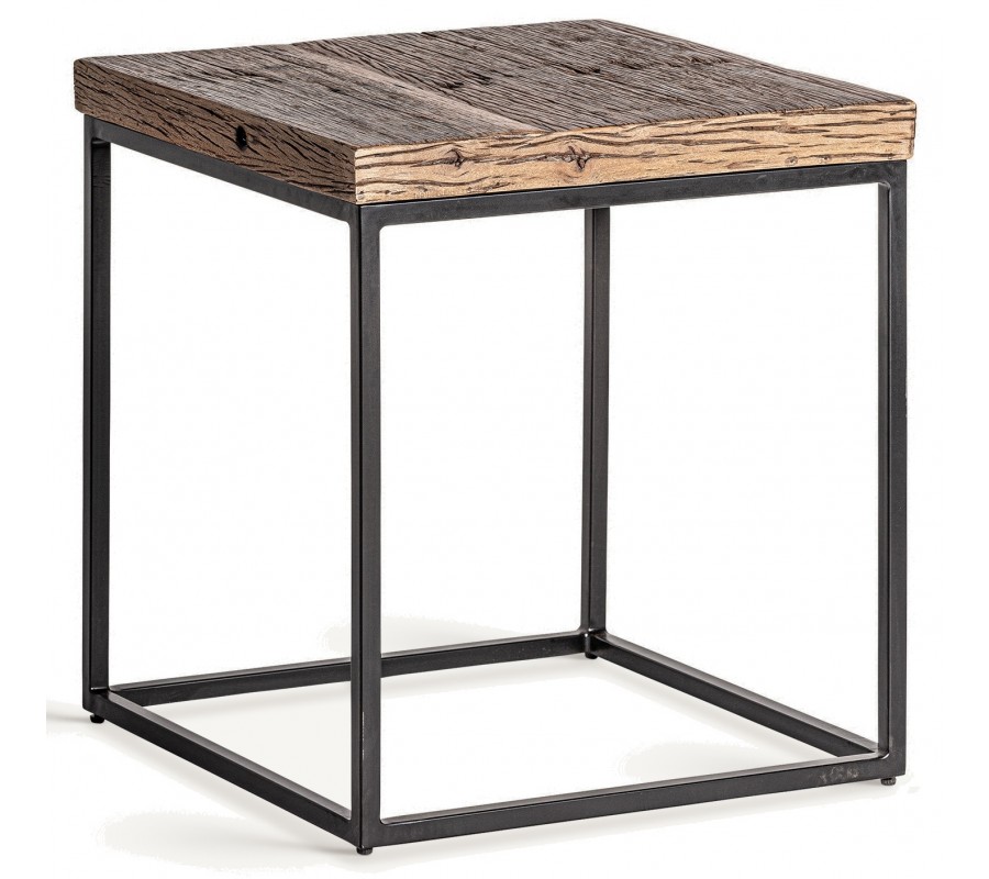 Industriálny štvorcový príručný stolík Draven s čiernou kovovou podstavou a masívnou drevenou doskou 55 cm