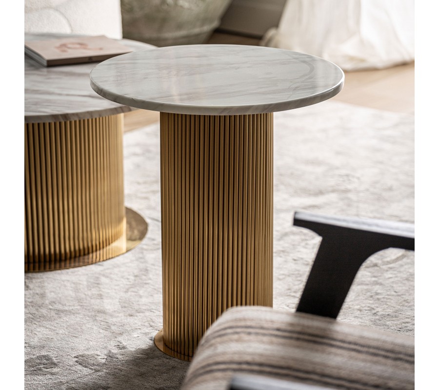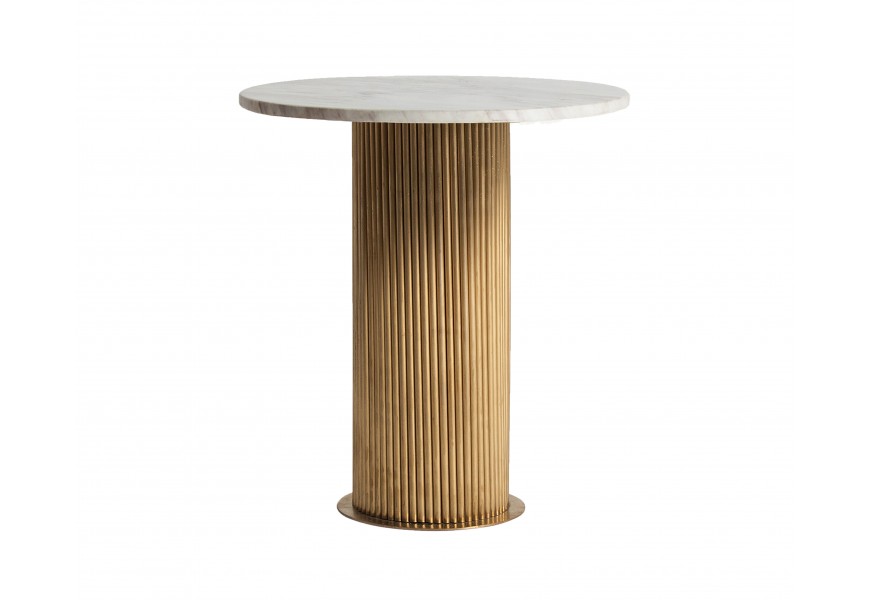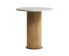 Luxusný art deco okrúhly mramorový zlatý príručný stolík Lensy s bielou vrchnou doskou a kovovou nohou 55 cm